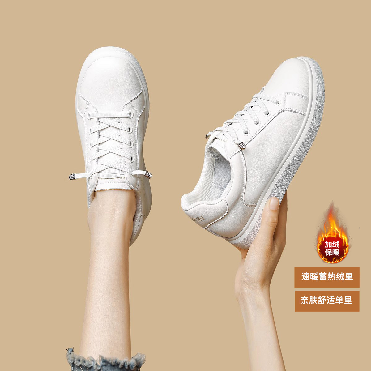 运动鞋厚底休闲板鞋女2026春季女款新款米色加绒女鞋内增高德训鞋