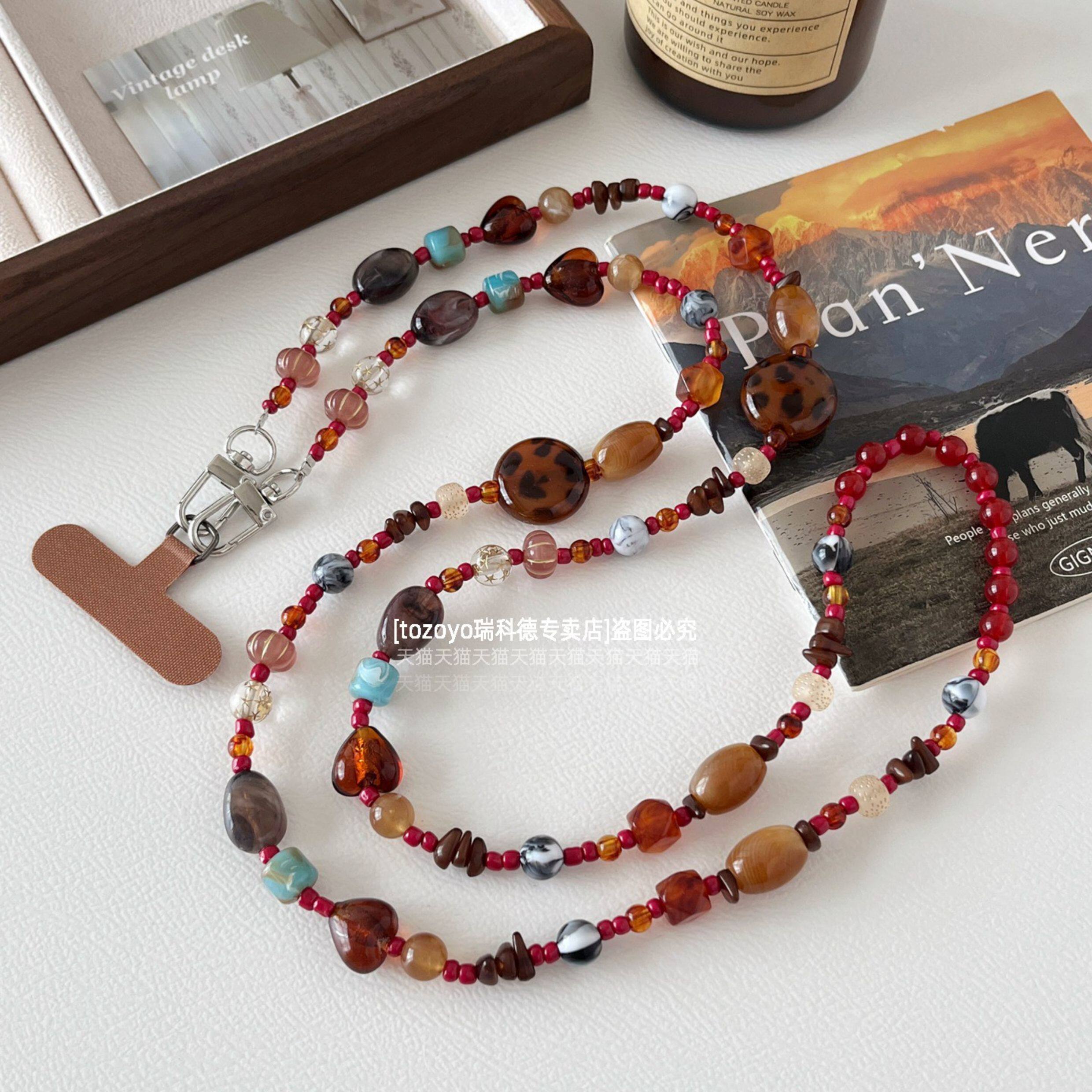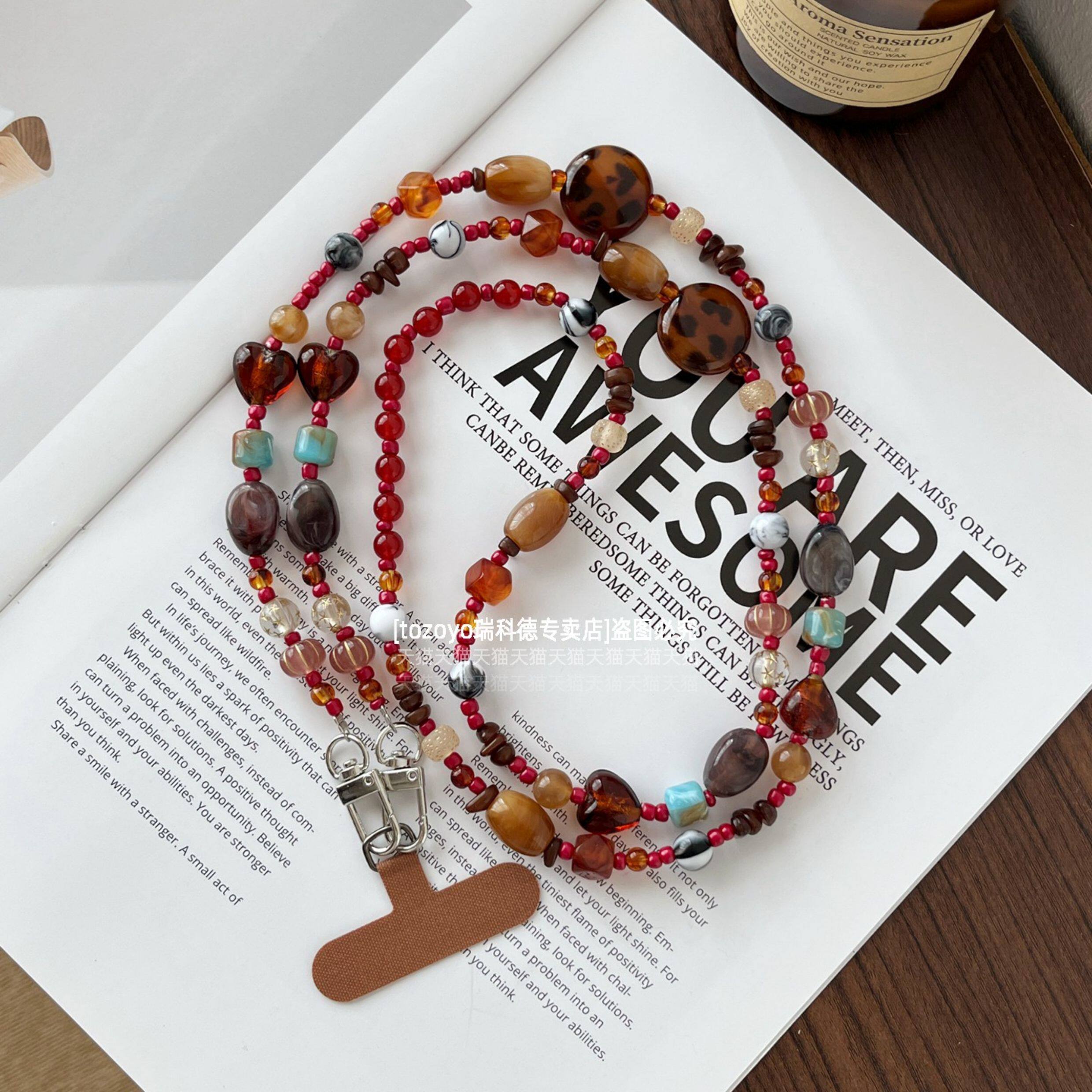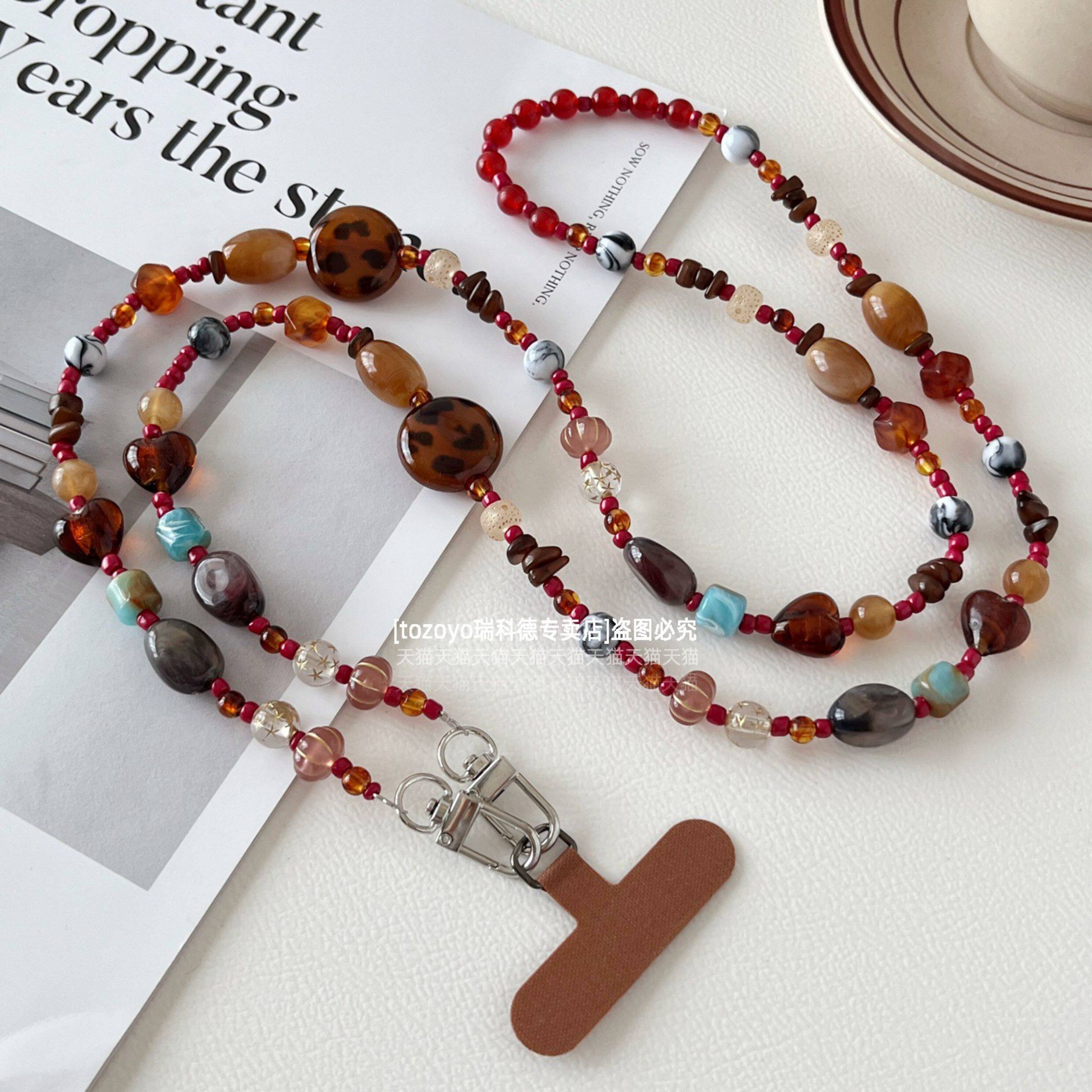 独特复古手机链精致琥珀色异形串珠背带挂链小众高级感斜挎可背链条豹纹珠链挂绳红棕色秋季新款气质包挂件壳