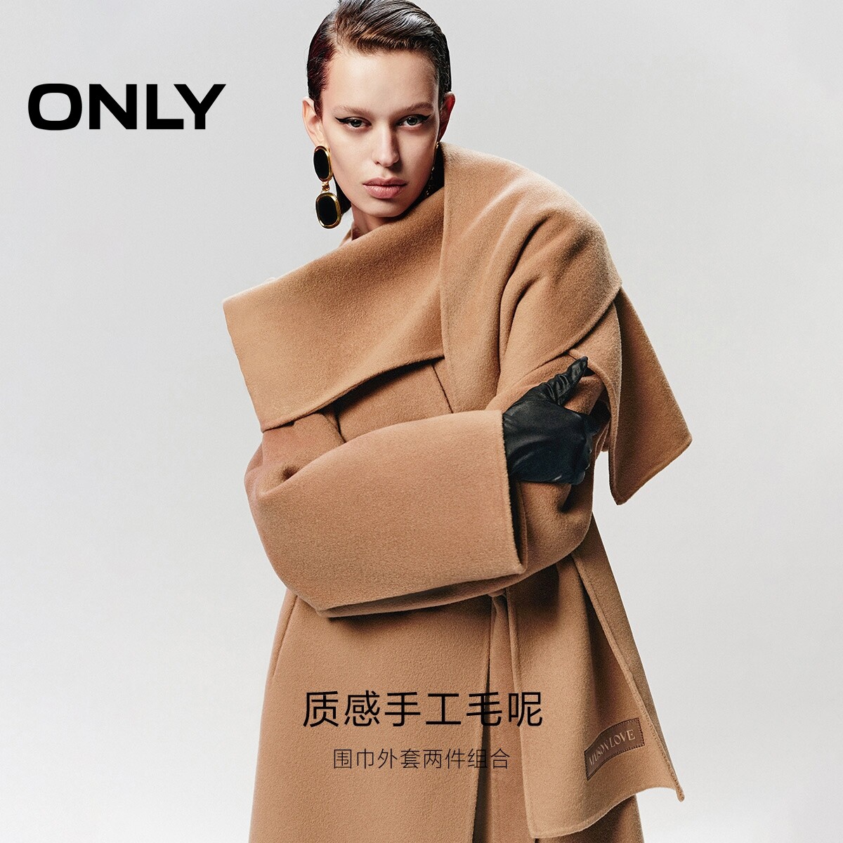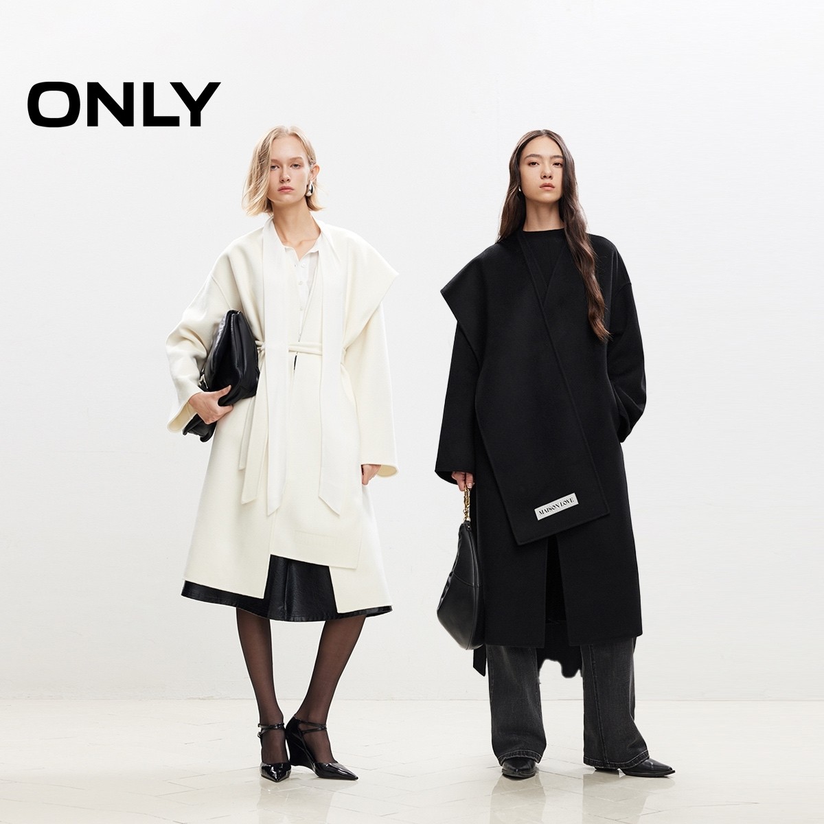 【白月光】ONLY冬季纯绵羊毛质感双面呢系带长款围巾毛呢大衣外套