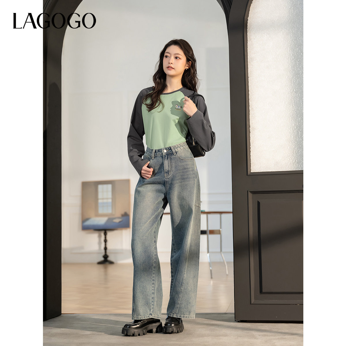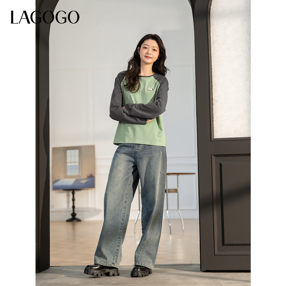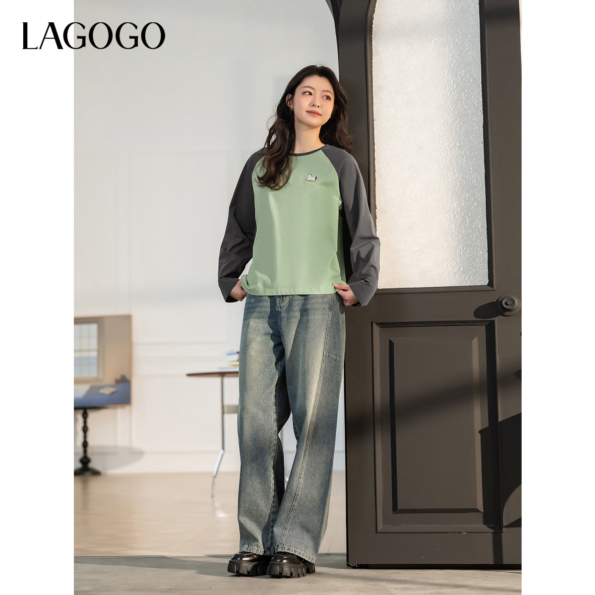 LAGOGO简约休闲淡人长袖T恤女拉谷谷春季新款舒适全棉上衣