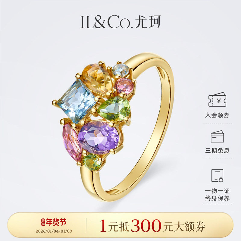 ILCO尤珂「和彩花雨」黄18K金海蓝宝天然宝石碧玺紫晶黄晶戒指女