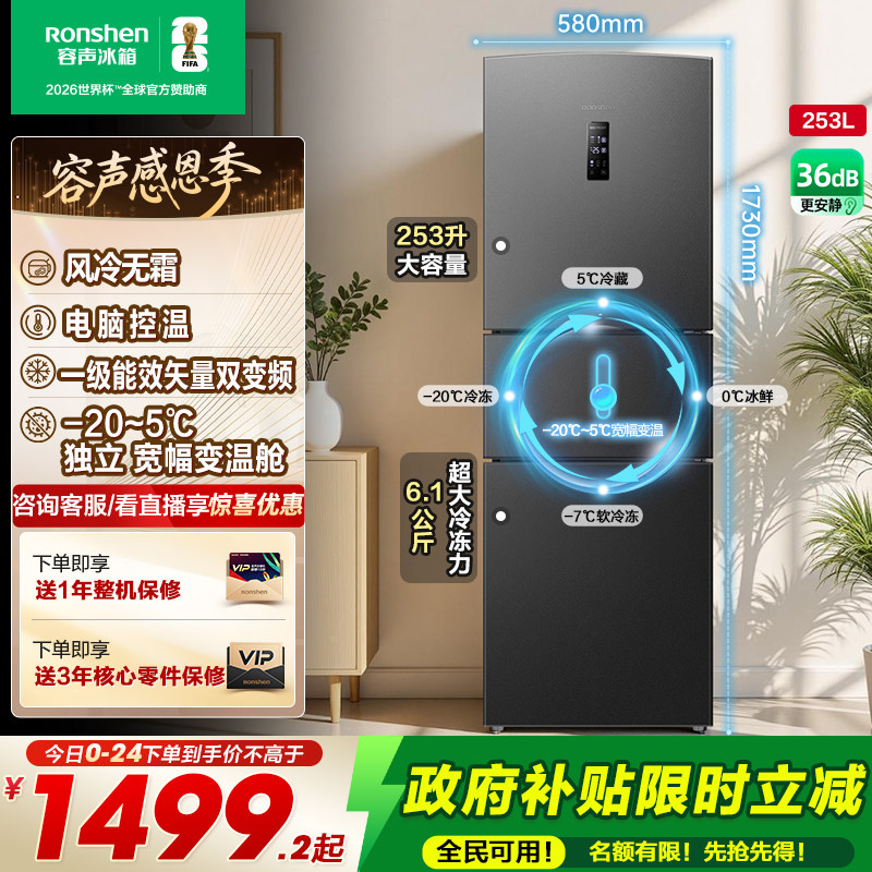 容声253L三开门变频风冷无霜一级节能家用超薄小型租房宿舍电冰箱