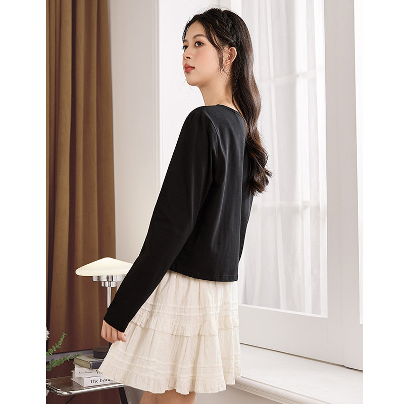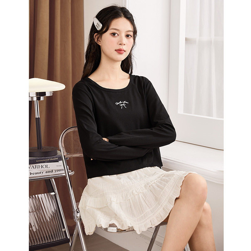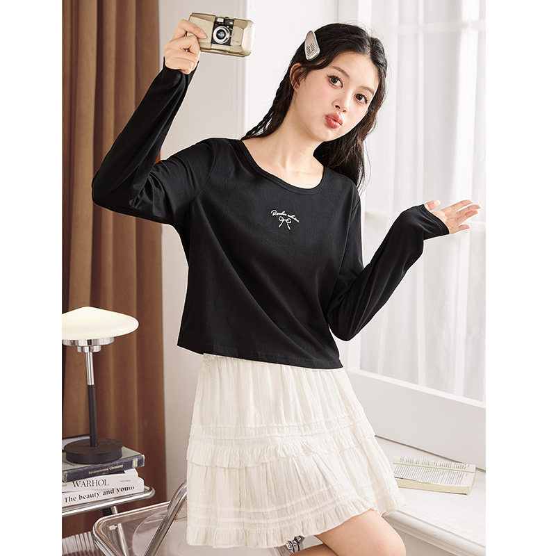 唐狮秋季新款短款长袖T恤女韩系百搭内搭甜美上衣女黑色显瘦