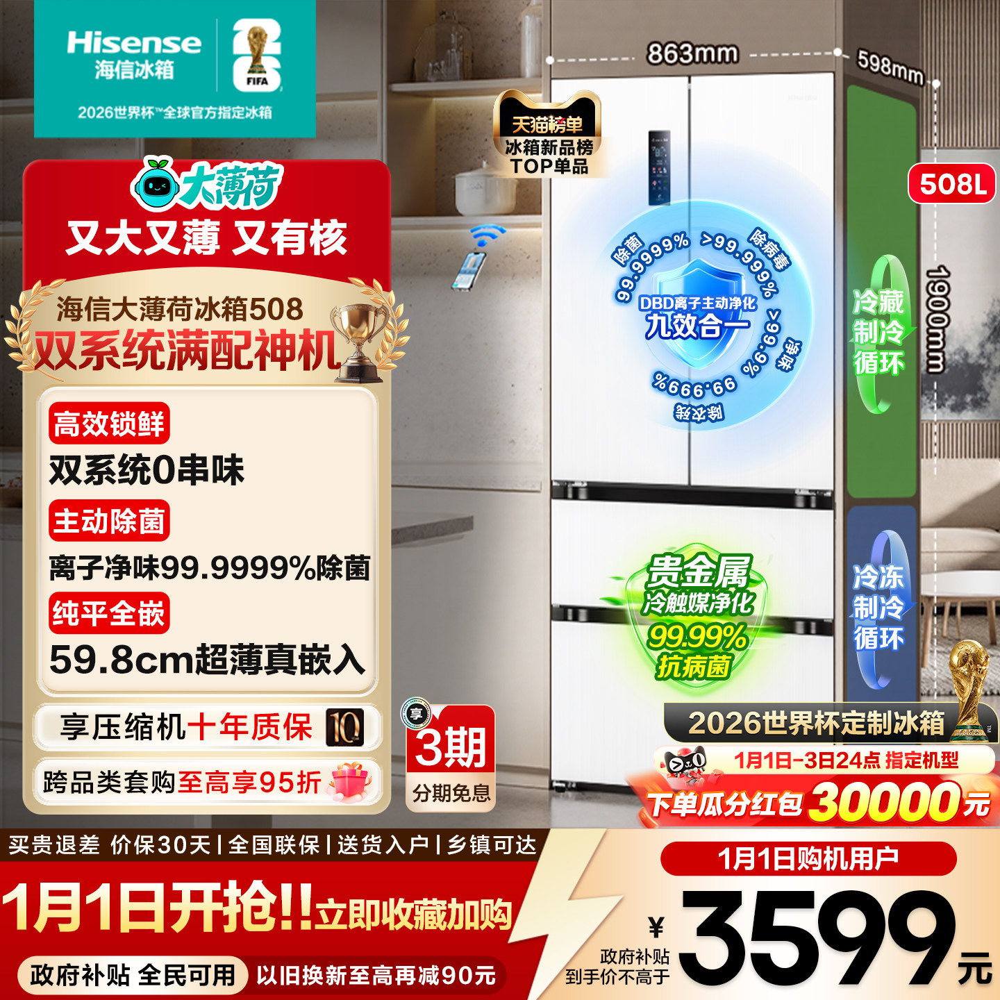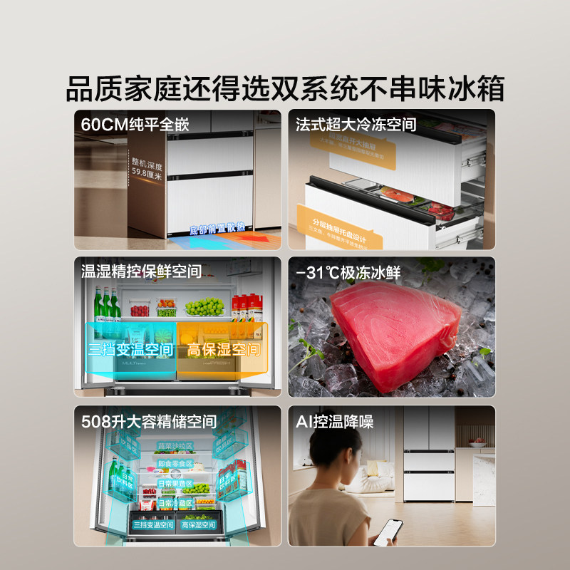 [双系统]海信大薄荷世界杯定制冰箱508法式四门超薄零嵌入式除菌