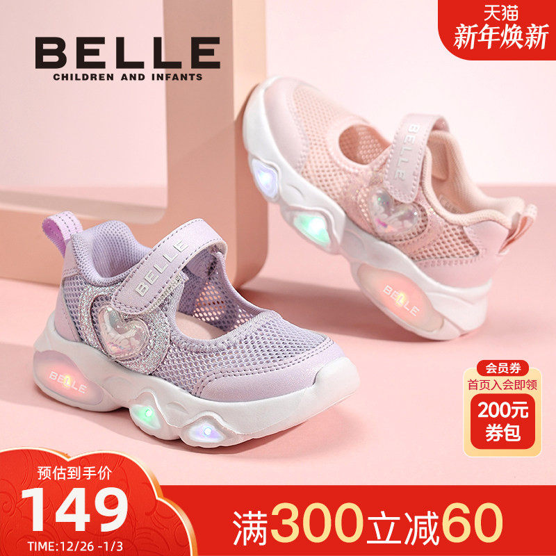 百丽女童闪灯运动凉鞋女宝带灯透气轻便网鞋发光鞋亮灯公主鞋夏季
