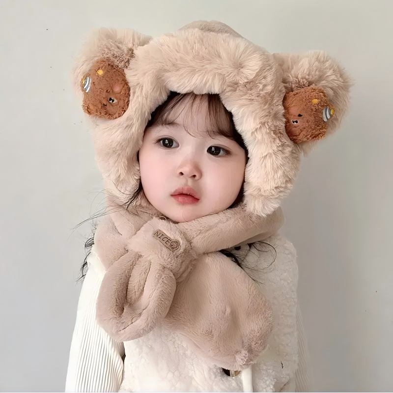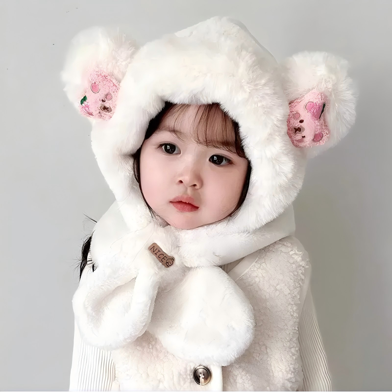 尼多熊儿童帽子围巾一体冬季防风帽宝宝毛绒护耳帽女童加厚保暖帽