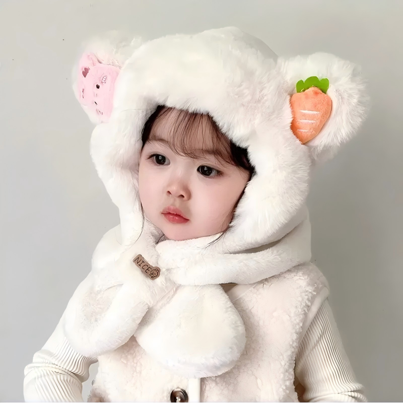 尼多熊婴儿帽子秋围脖一体宝宝毛绒帽防风护耳帽冬季保暖婴幼儿帽