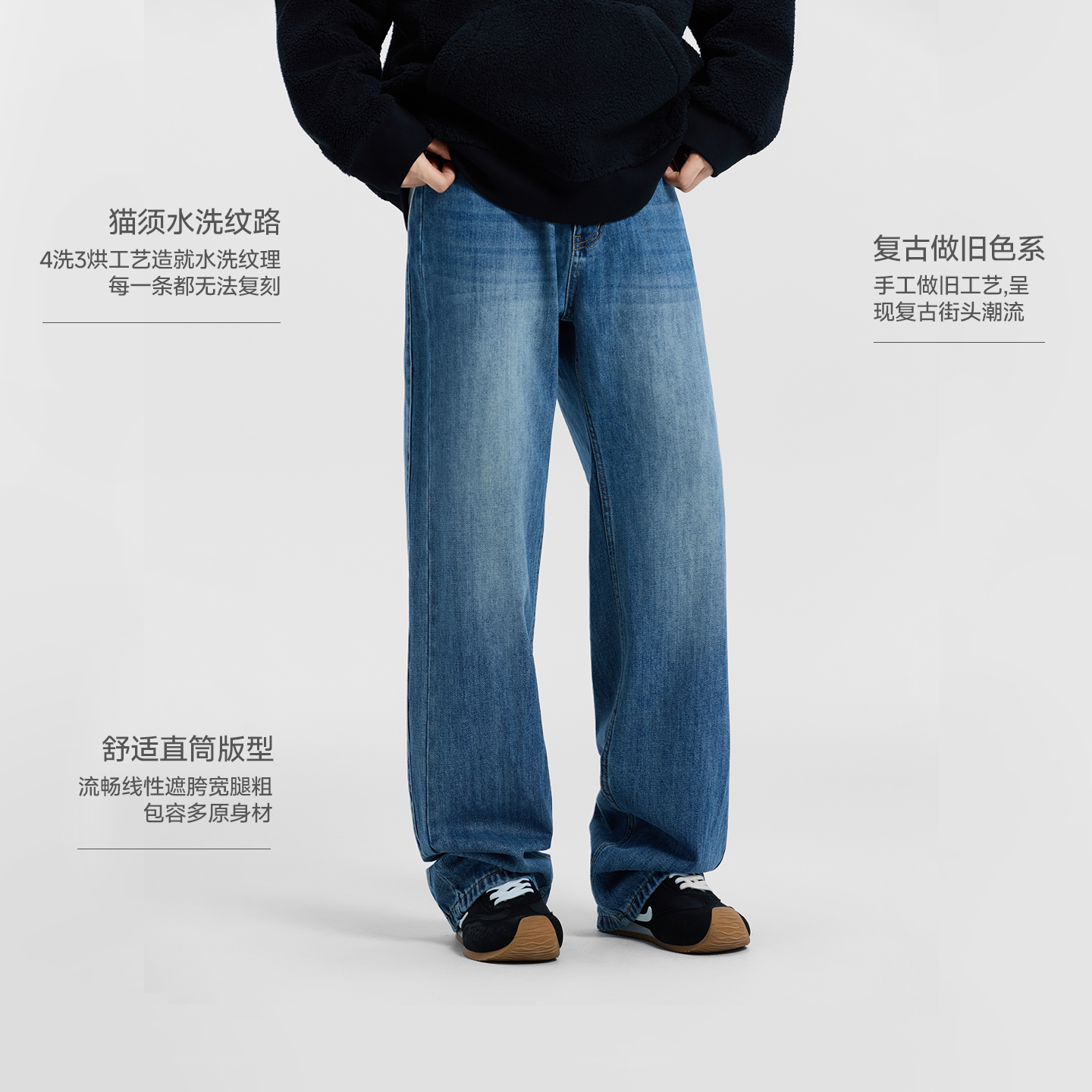 森马牛仔裤男猫须做旧复古宽松直筒裤2025秋冬新款长裤子经典质感