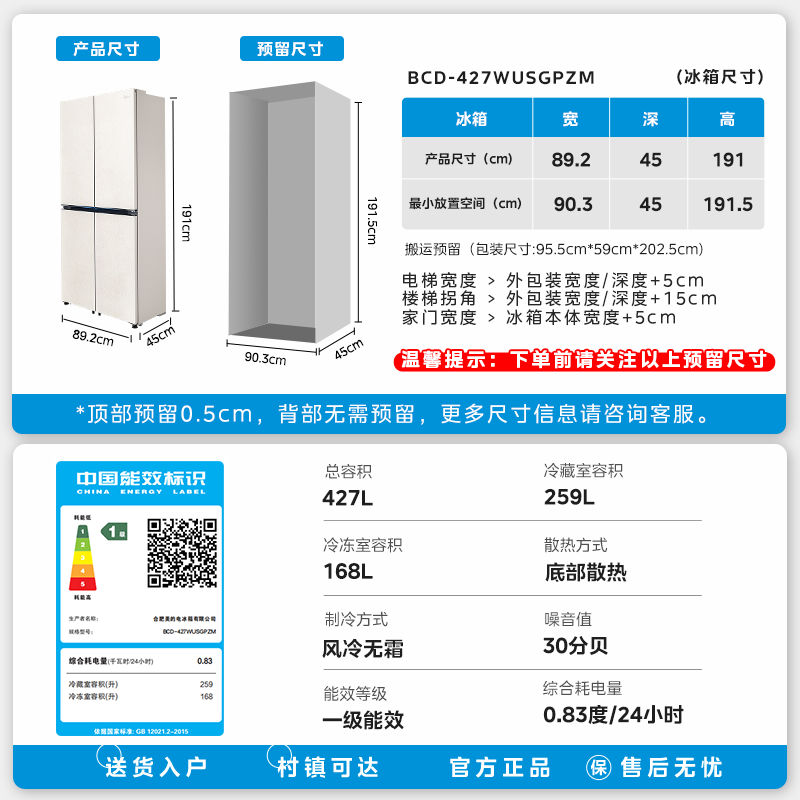 【精品】美的新品427十字双开四门45cm超薄零嵌餐边柜电冰箱家用