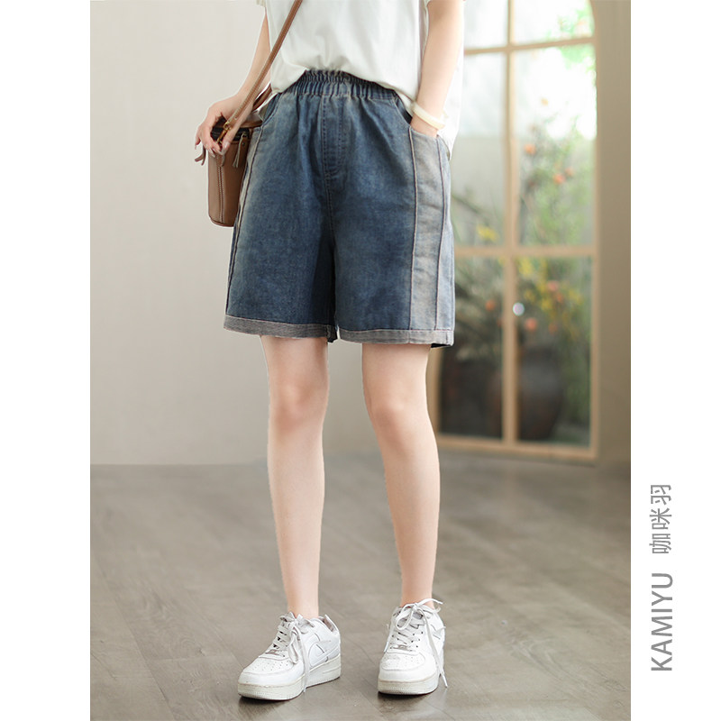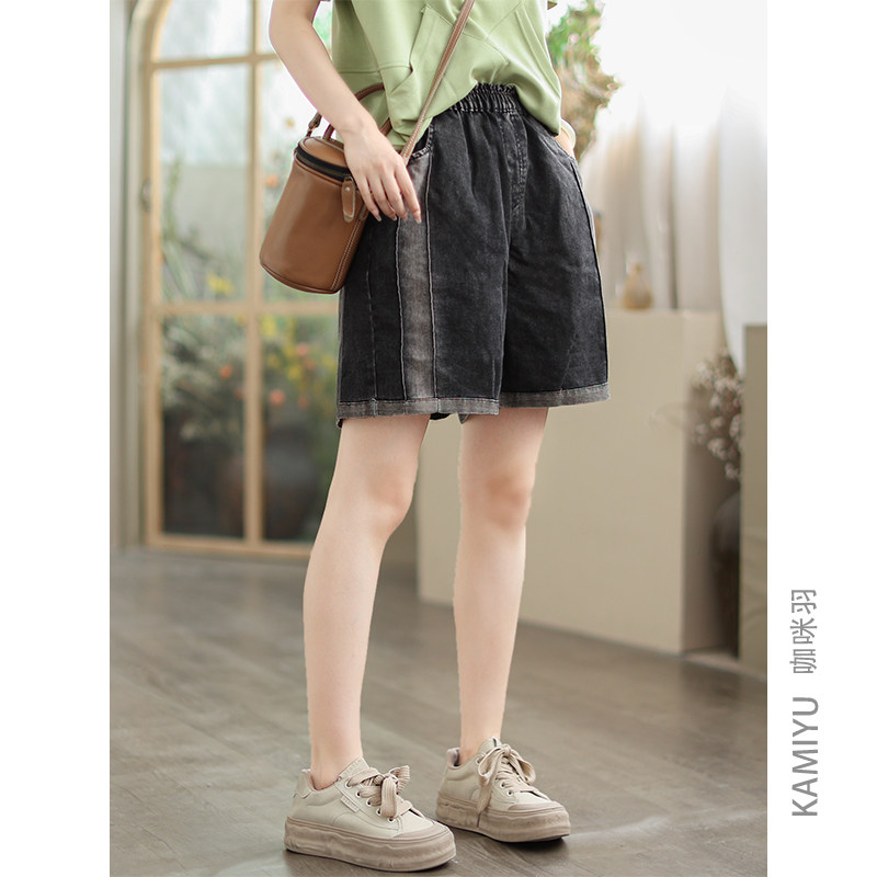 咖咪羽牛仔短裤女夏季新款时尚文艺撞色拼接直筒宽松女装五分裤女