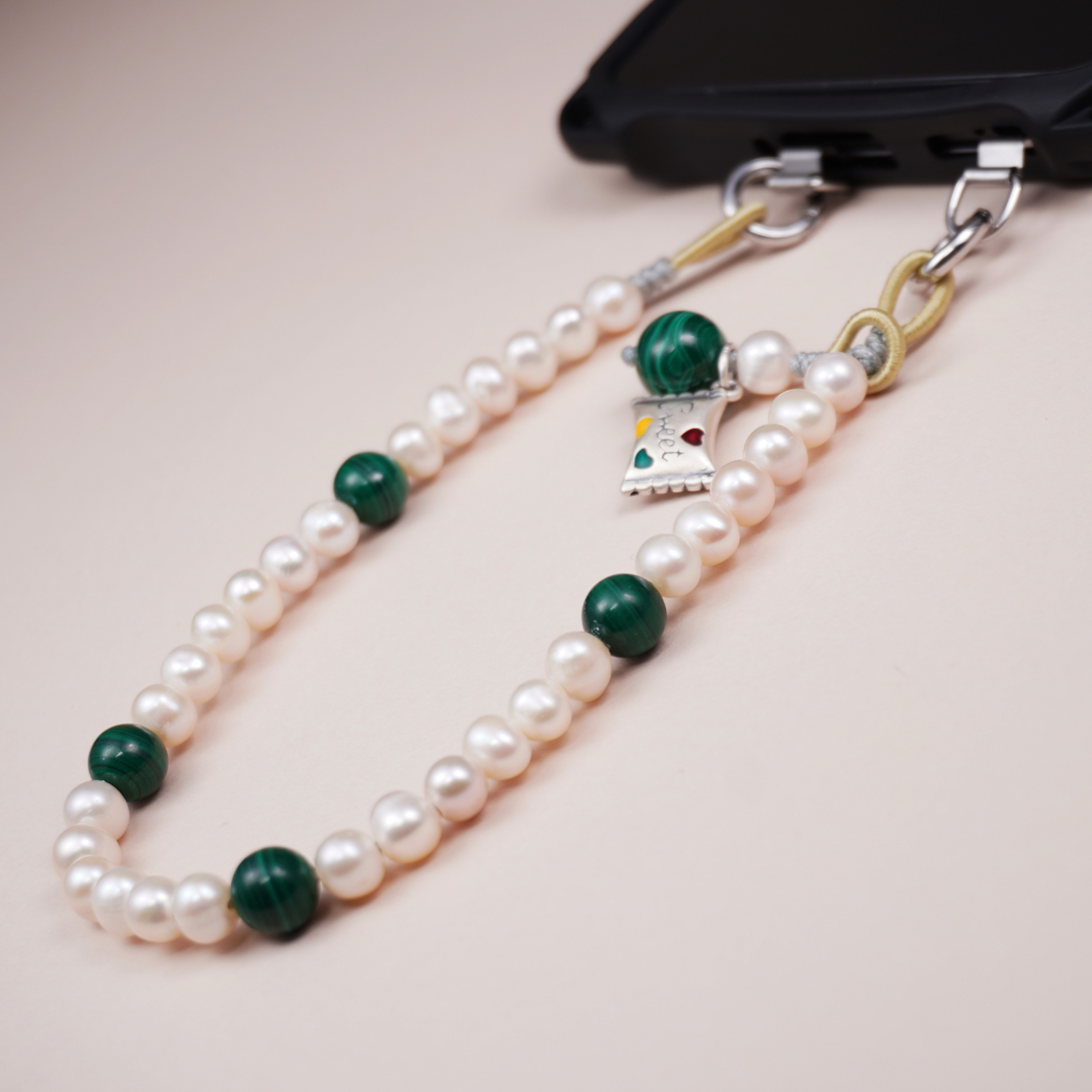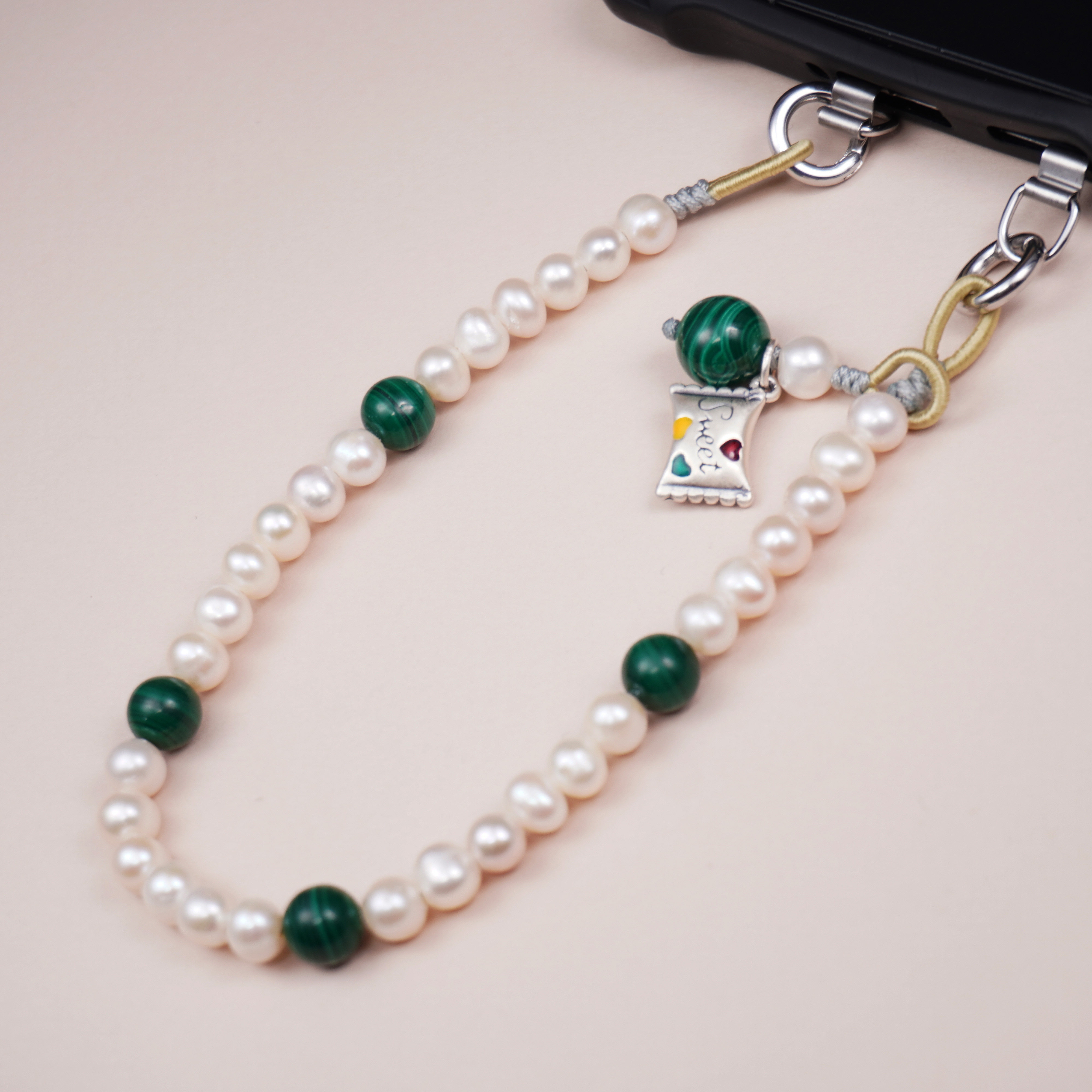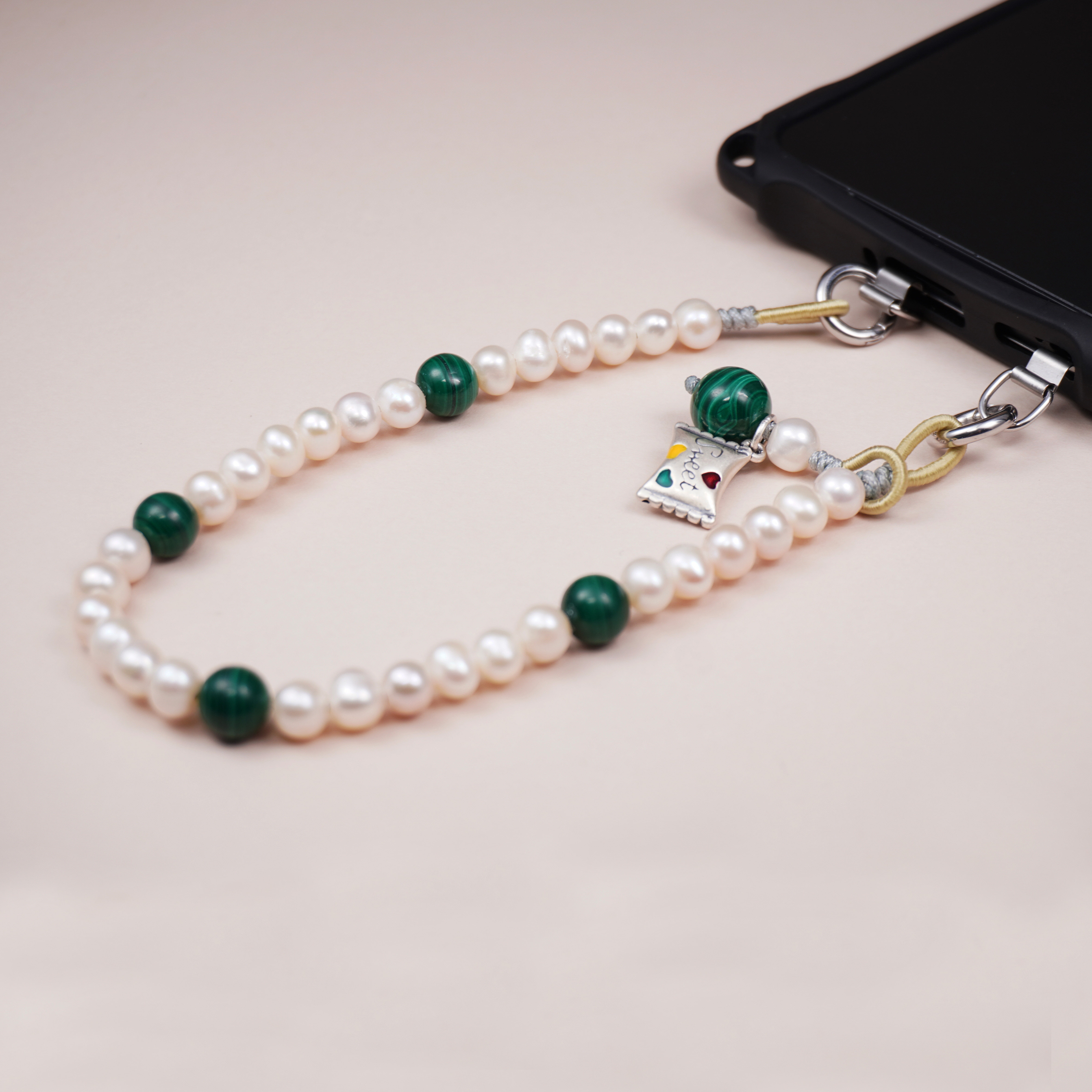 天然珍珠手机链女款手腕挂链新中式挂链小清新孔雀石手机挂件斜挂