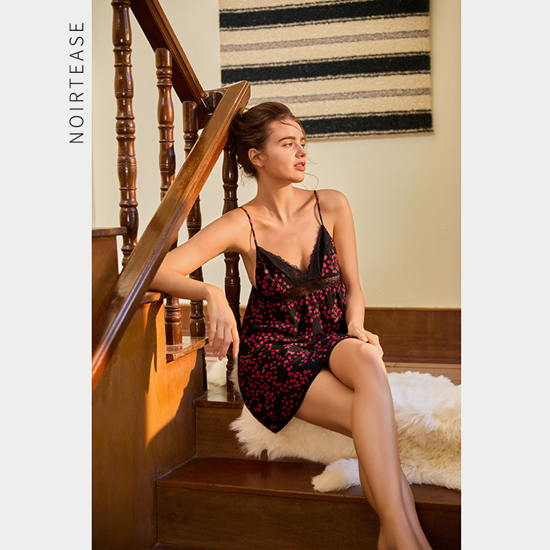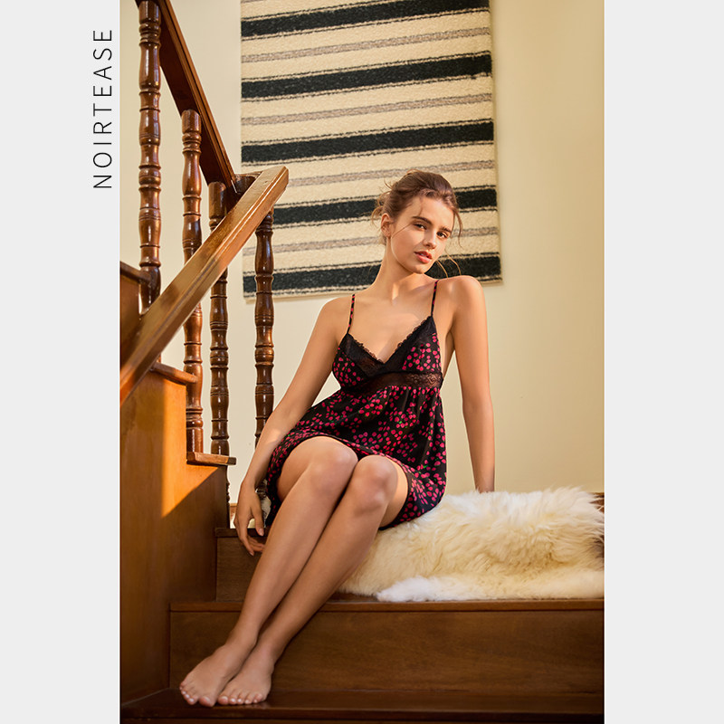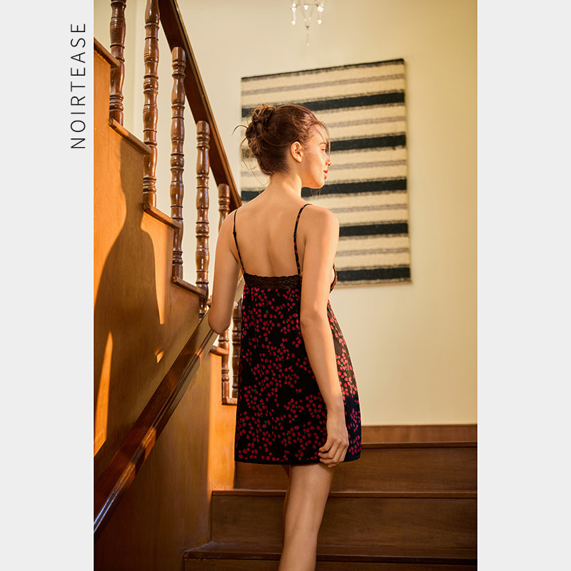 NoirTease夏季新款丝质雪纺睡裙女性感蕾丝短款显瘦吊带睡衣舒适