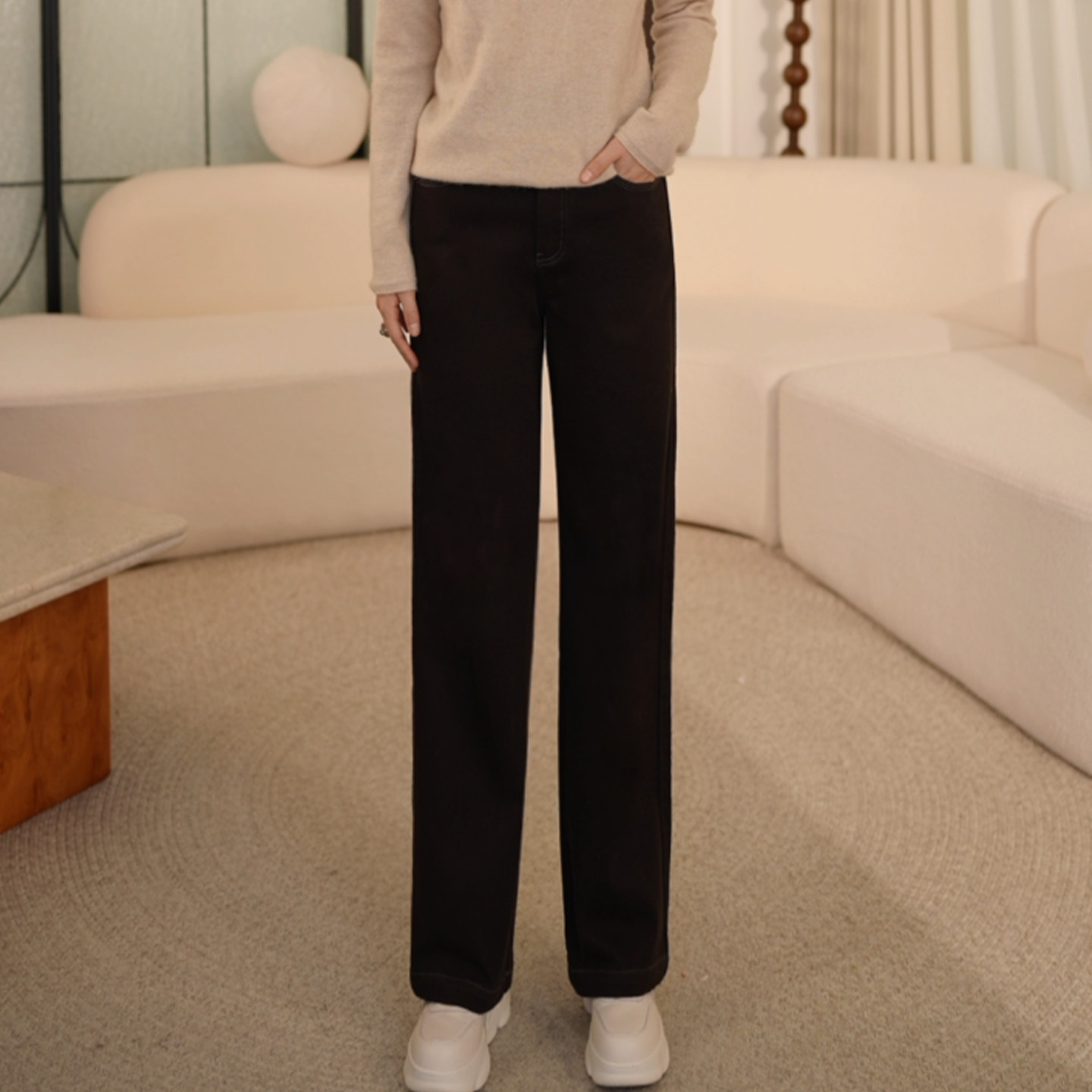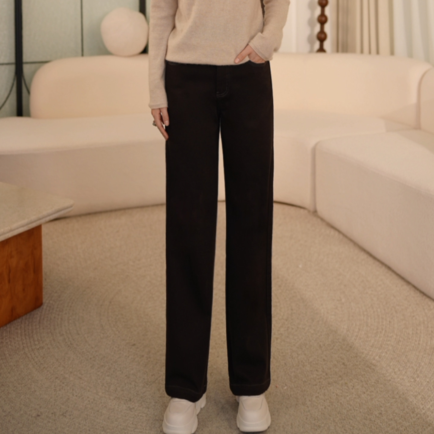 枫竺中高腰窄版遮胯显瘦加绒直筒牛仔裤女2025冬季百搭简约长裤