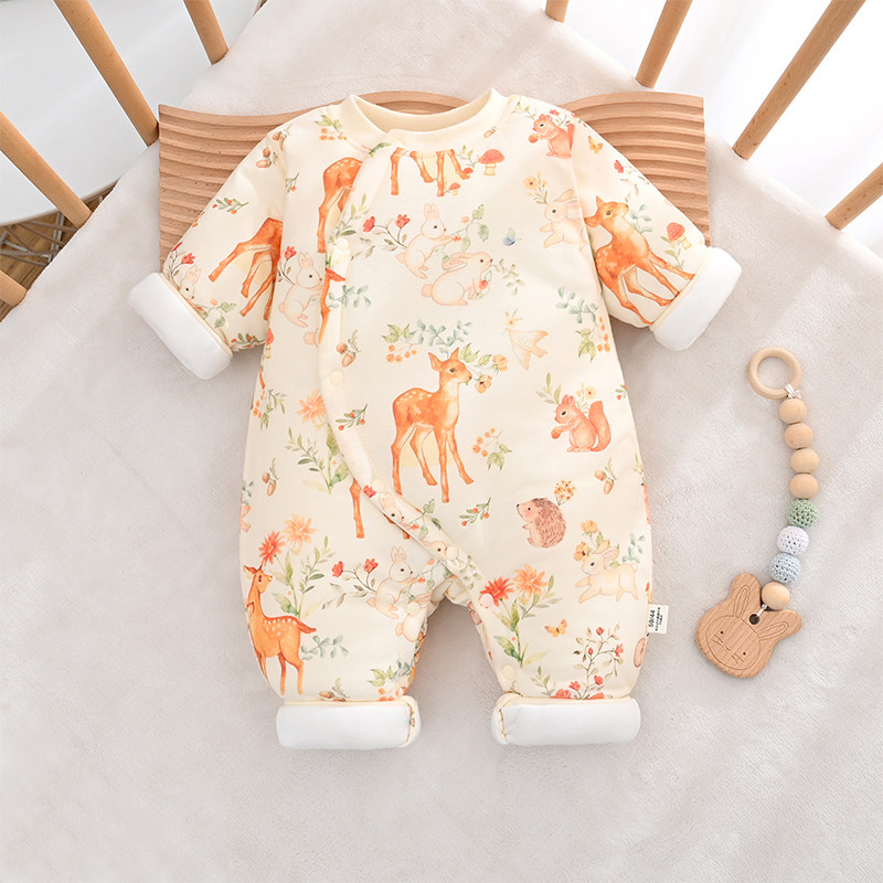 婧麒婴儿连体衣秋冬保暖新生儿夹棉加厚偏襟哈衣婴幼儿外出爬爬服