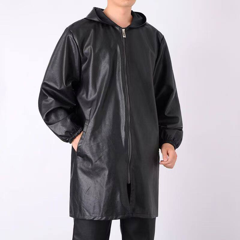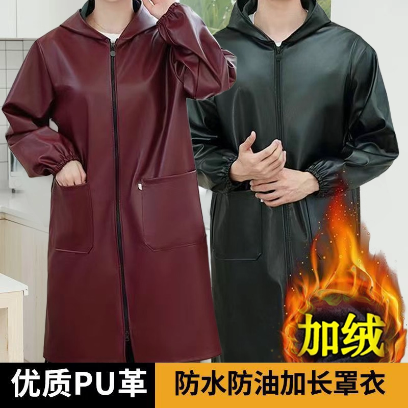 皮革加绒PU防水厚罩衣男女工作服厨房围裙长袖冬防油正穿加长防风