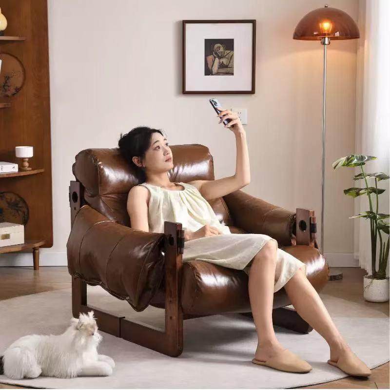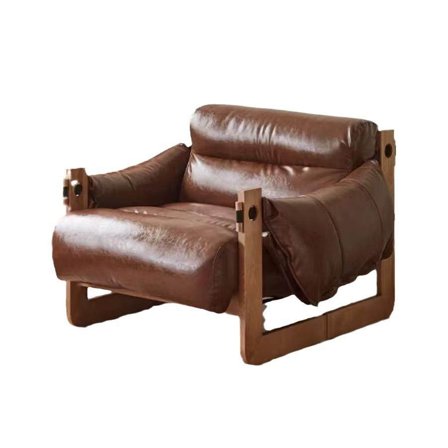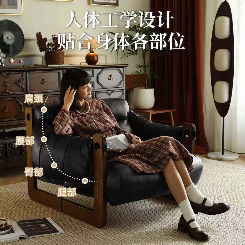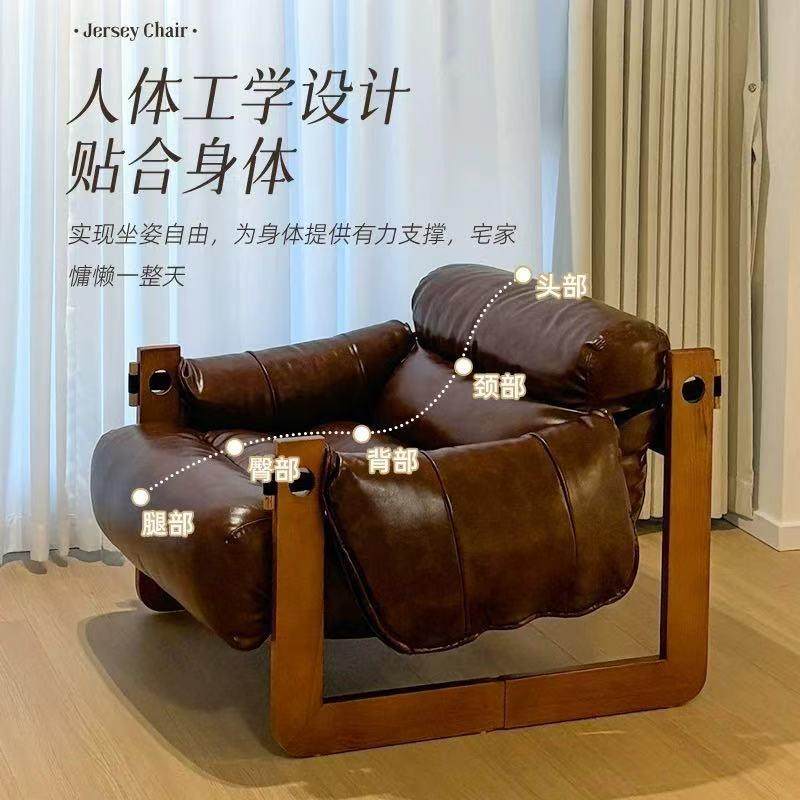 中古风实木单人沙发椅泽西岛椅客厅皮沙发懒人沙发休闲椅复古躺椅
