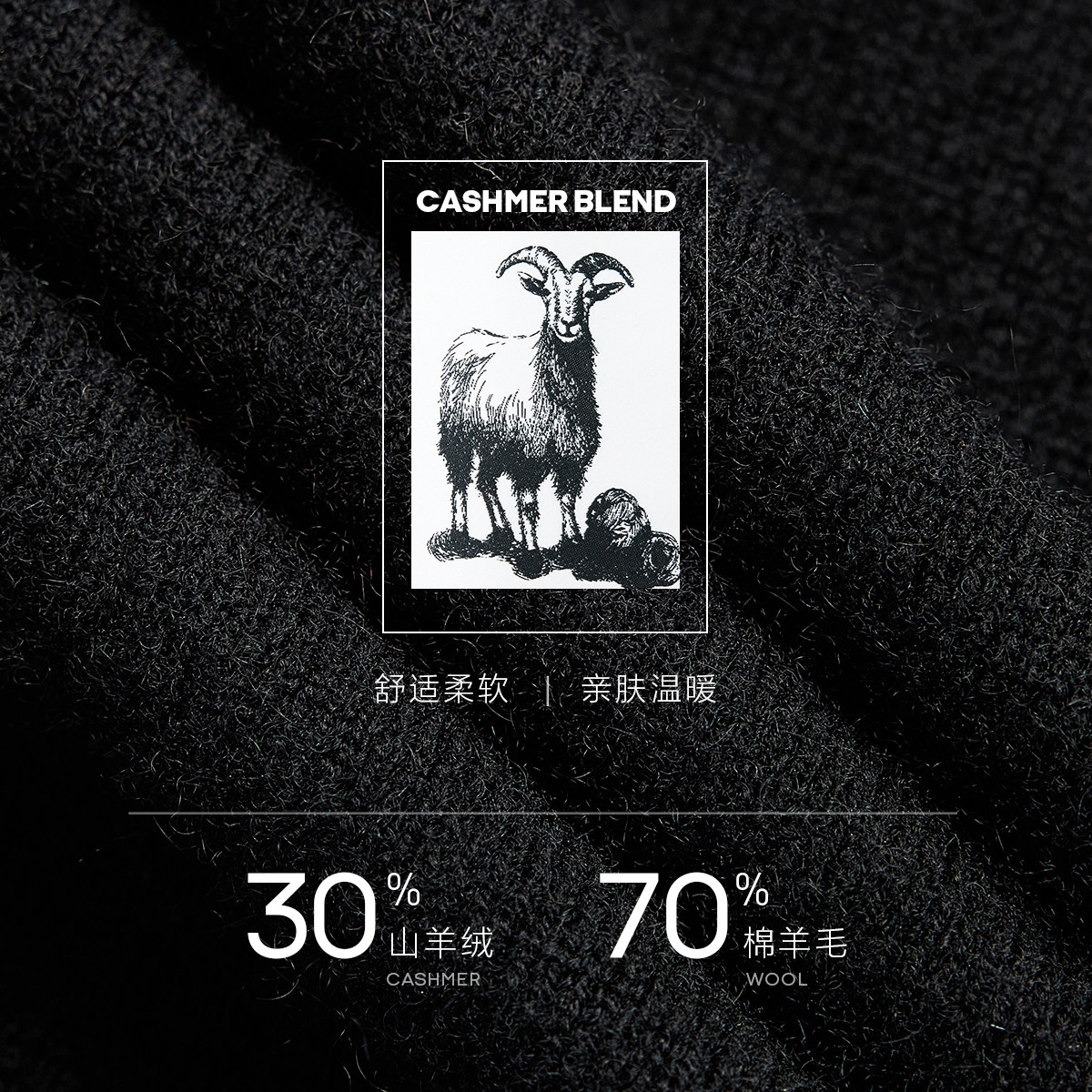 羊绒羊毛混纺材质;30%羊绒70%美利奴羊毛