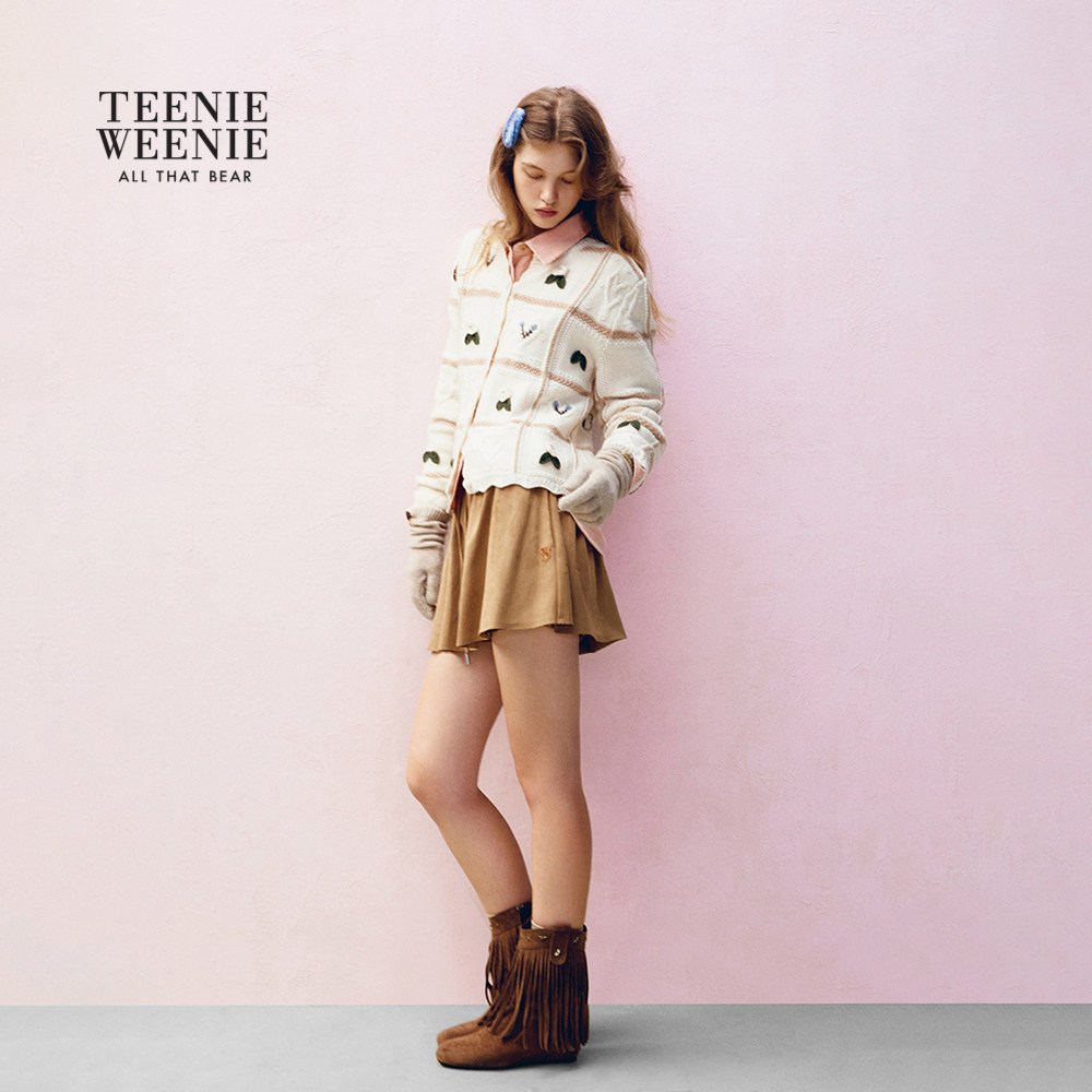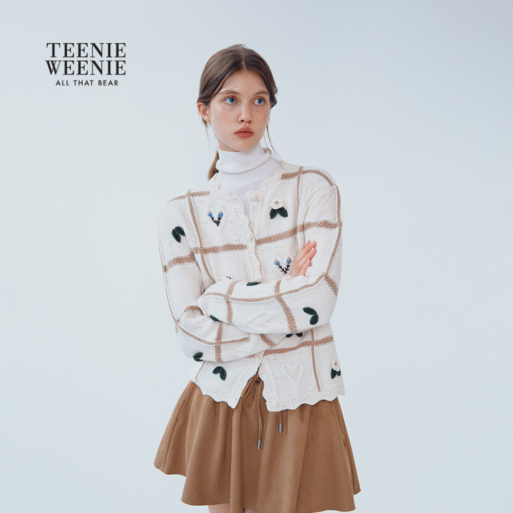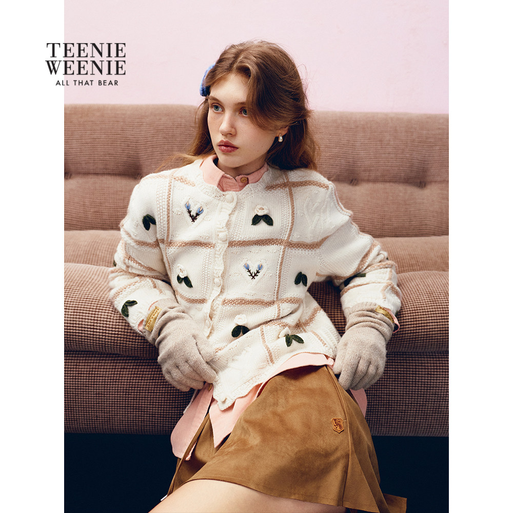TeenieWeenie小熊女装毛针织衫2025冬季新款手工钩花圆领开衫毛衣