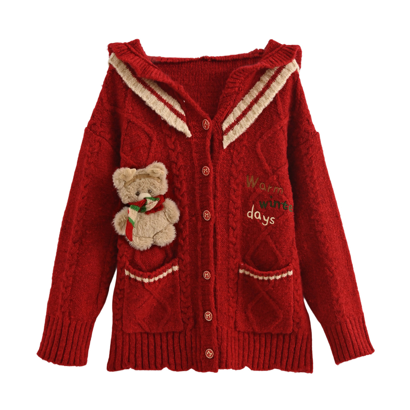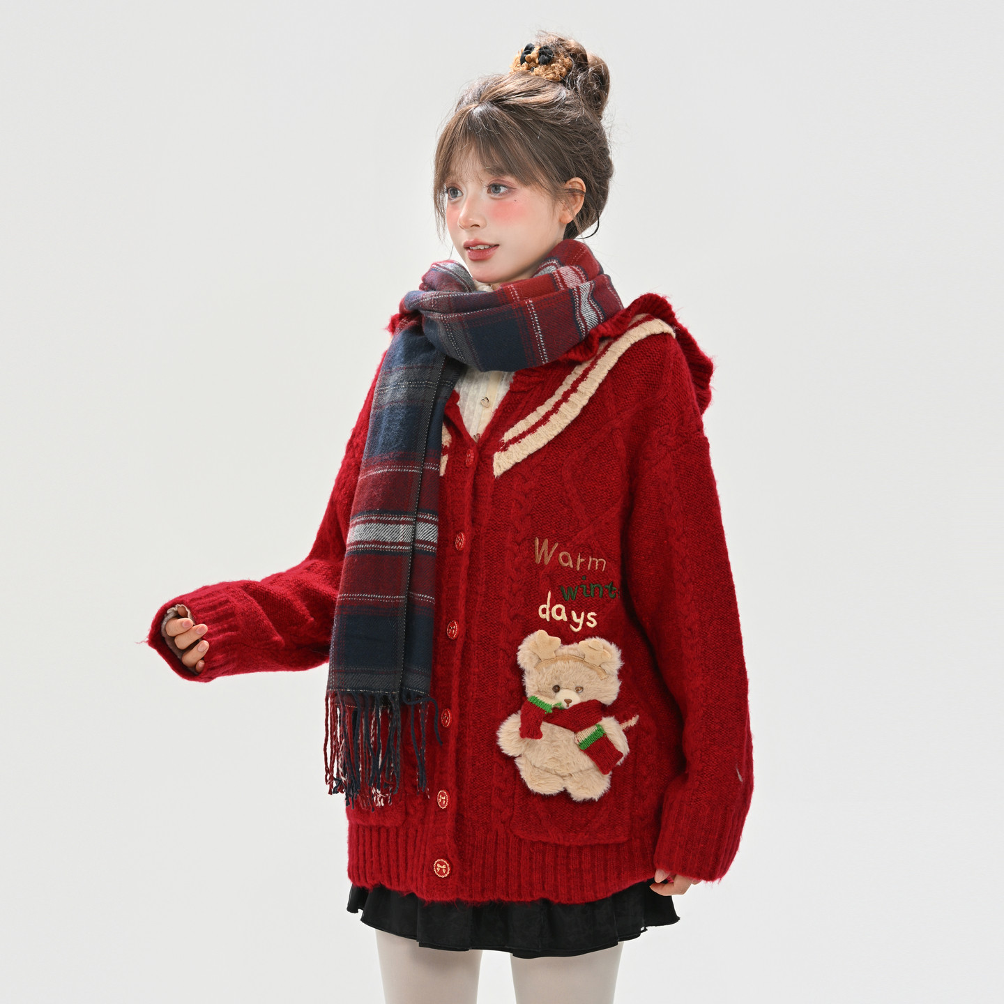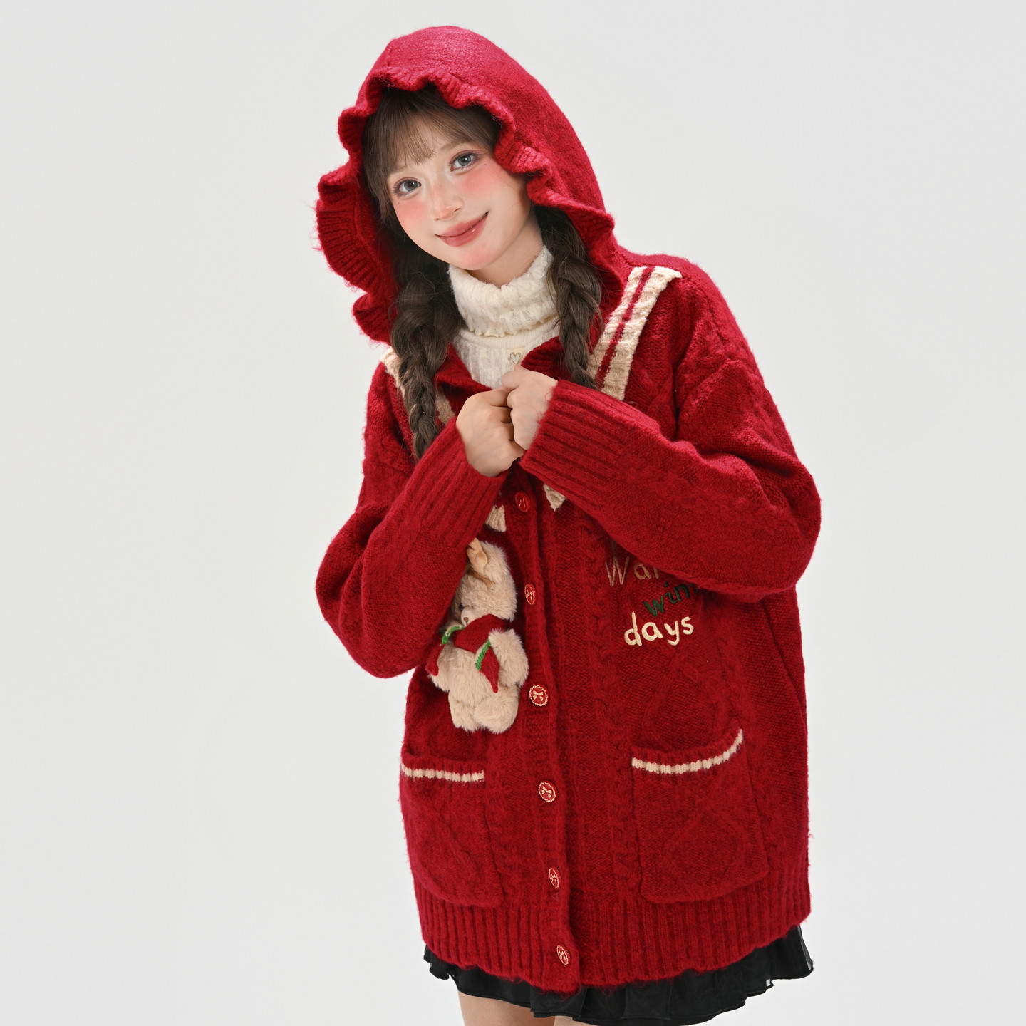 【圣诞感恩回馈价】森女部落圣诞氛围感显白宽松连帽毛衣针织开衫
