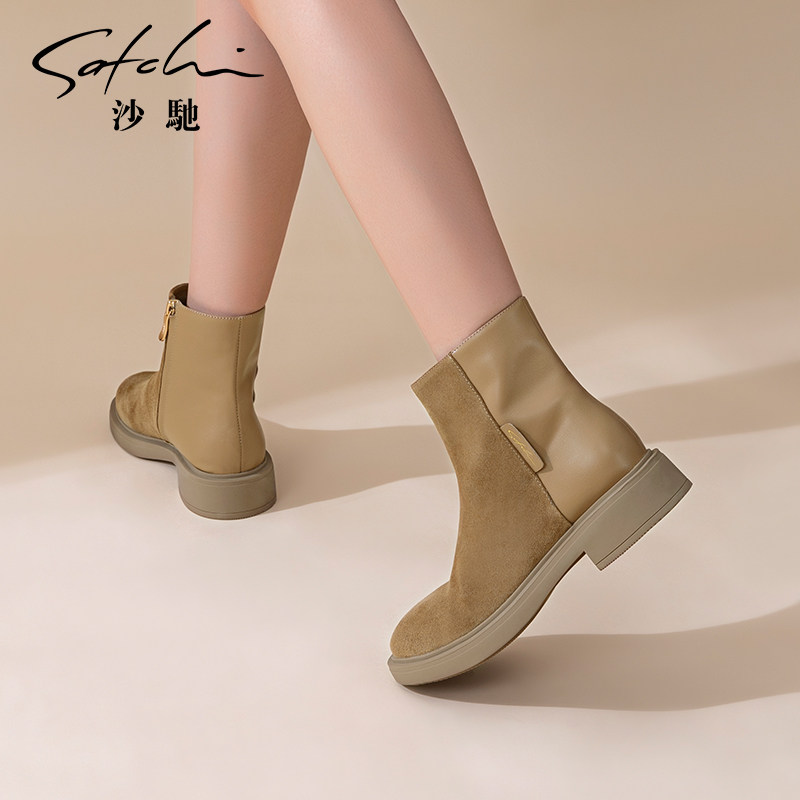 沙驰女鞋时尚拼接低粗跟时装靴2025年秋冬季新款真皮短靴瘦瘦靴子