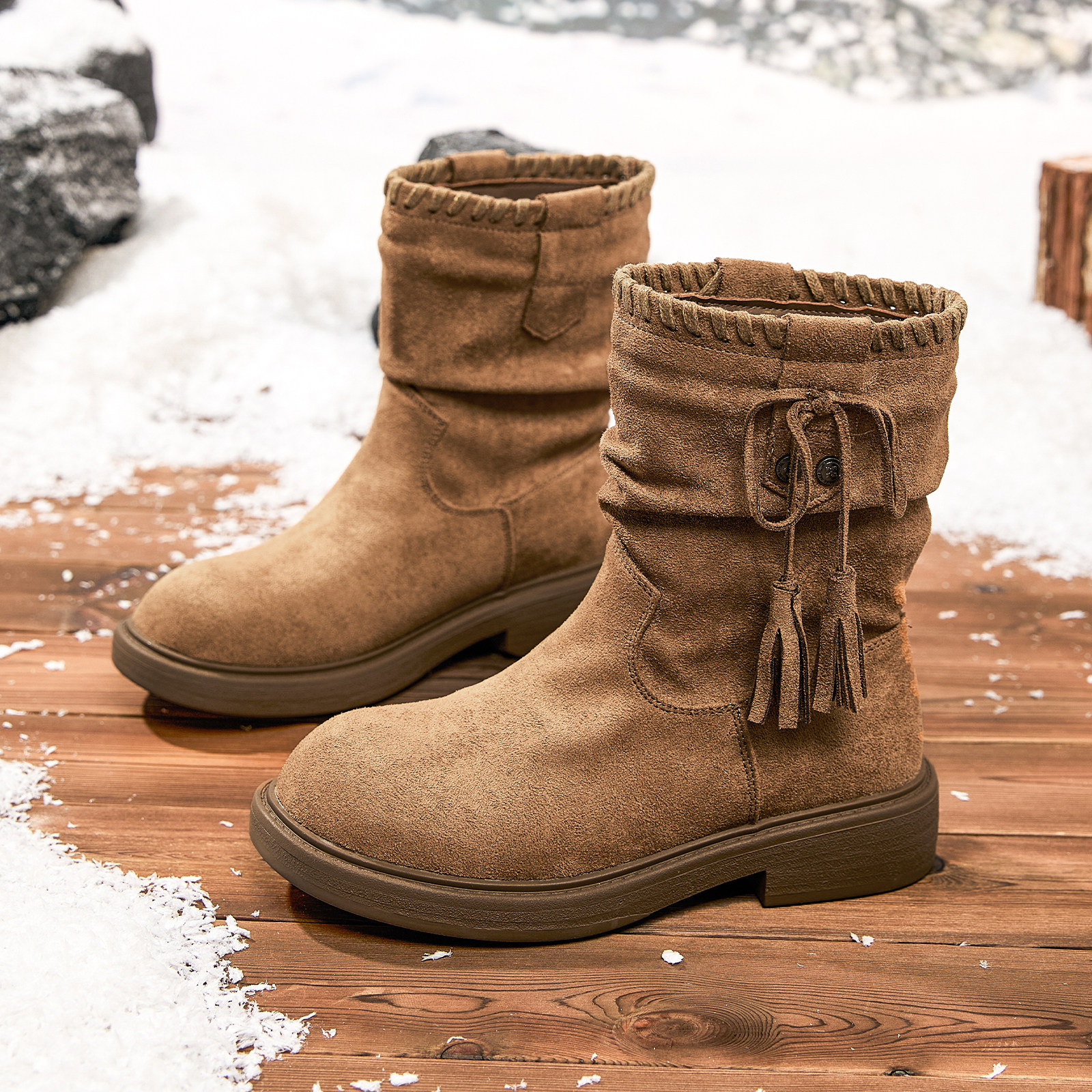 Semir女鞋堆堆靴2025秋冬季新款复古西部骑士靴子短靴粗跟瘦瘦靴