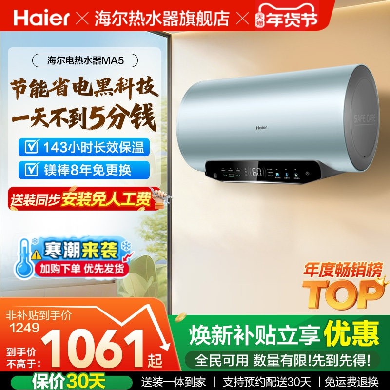 [政府换新补贴]海尔电热水器超一级能效速热家用洗澡变频60升MA5
