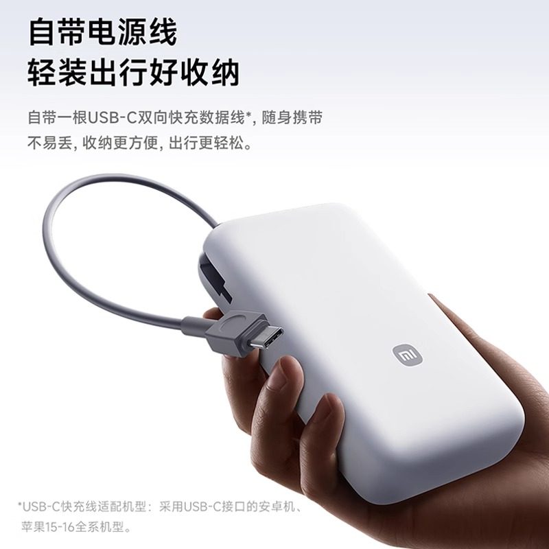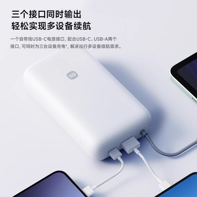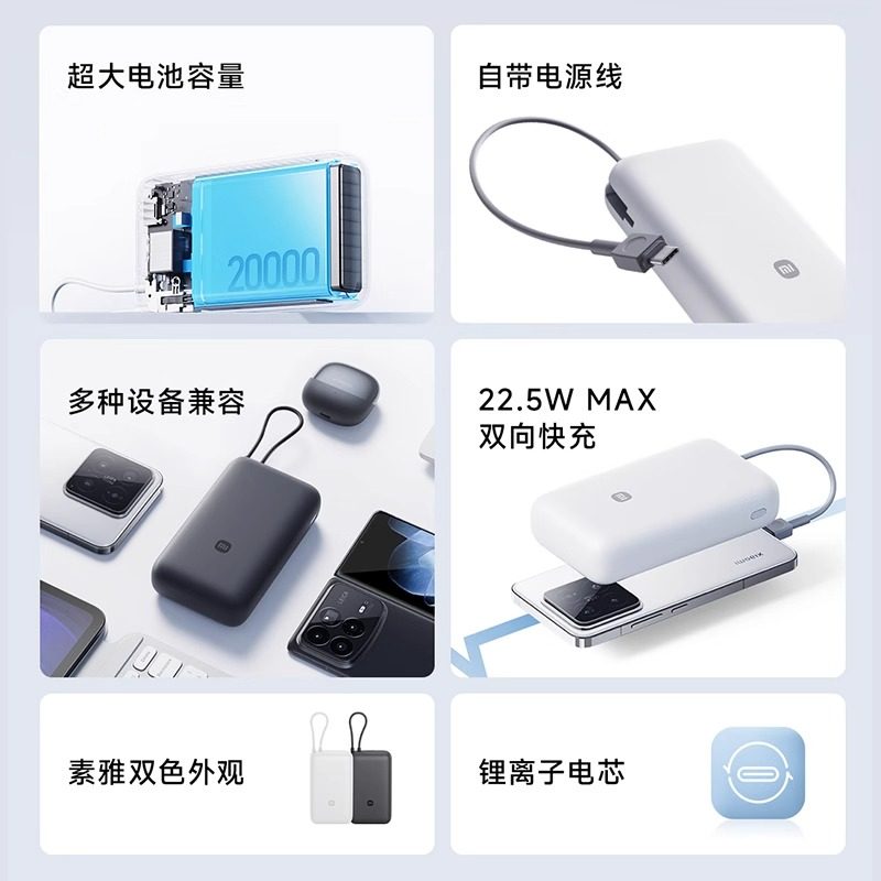 小米自带线充电宝20000 22.5W自带线双向快充小巧超大容量便携移动电源