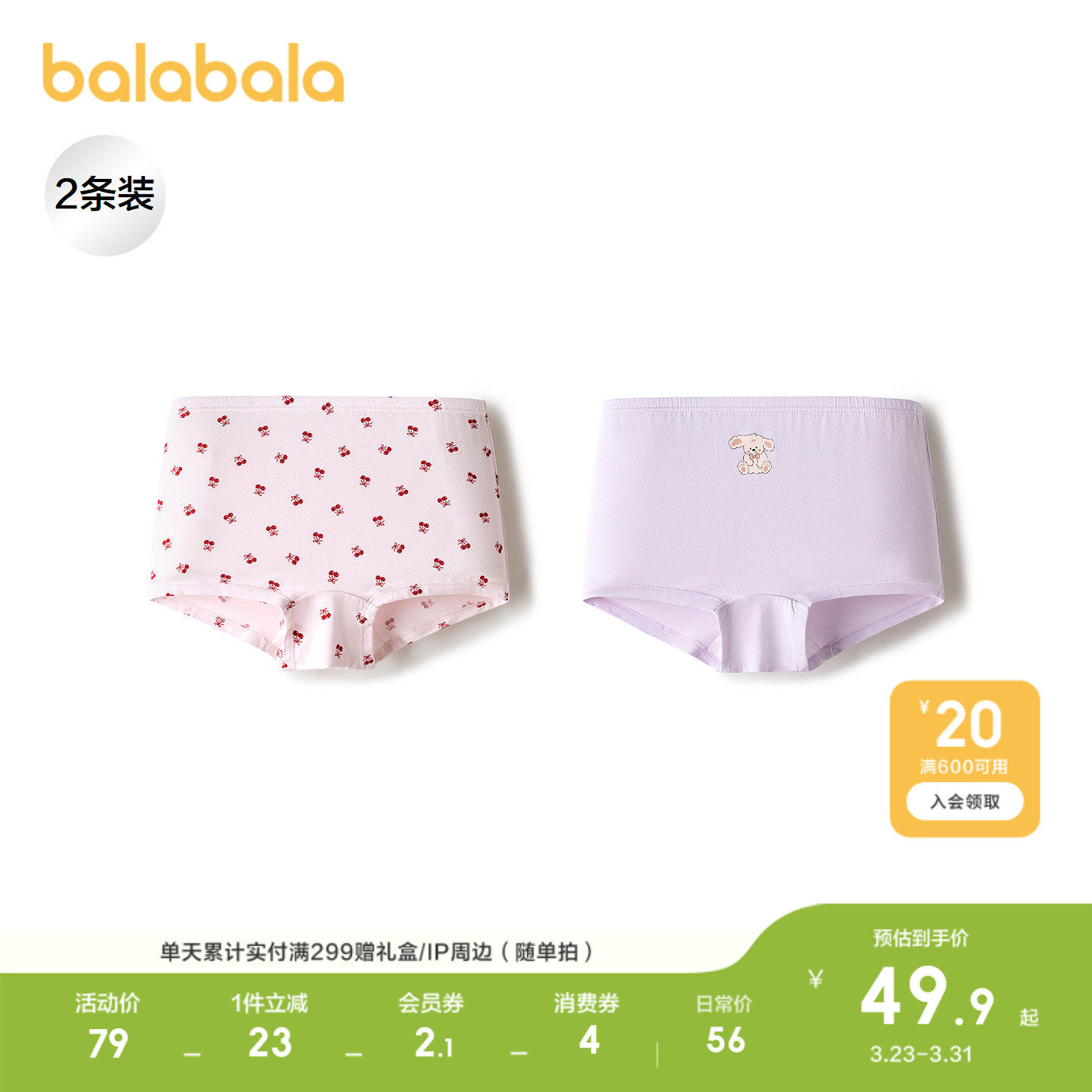 【商场同款】巴拉巴拉女童内裤棉儿童四角短裤抗菌裆不夹PP两条装