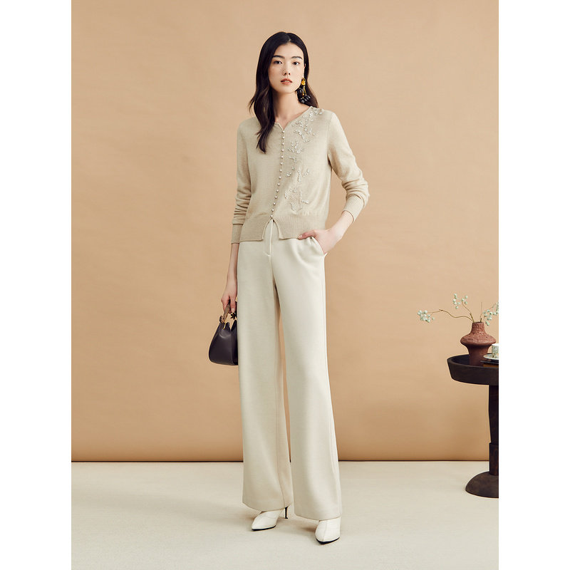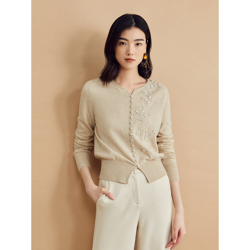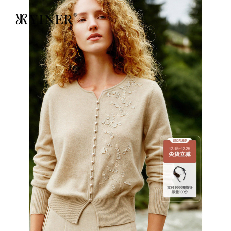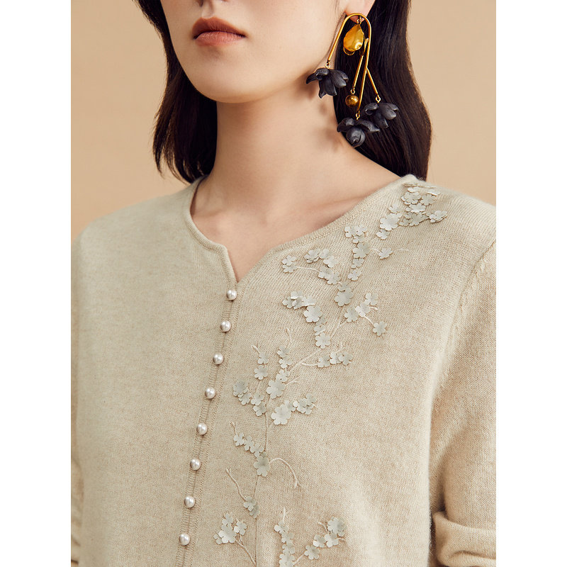 YINER音儿女装冬季新中式立体花朵钉珠装饰阿拉善纯羊绒针织衫