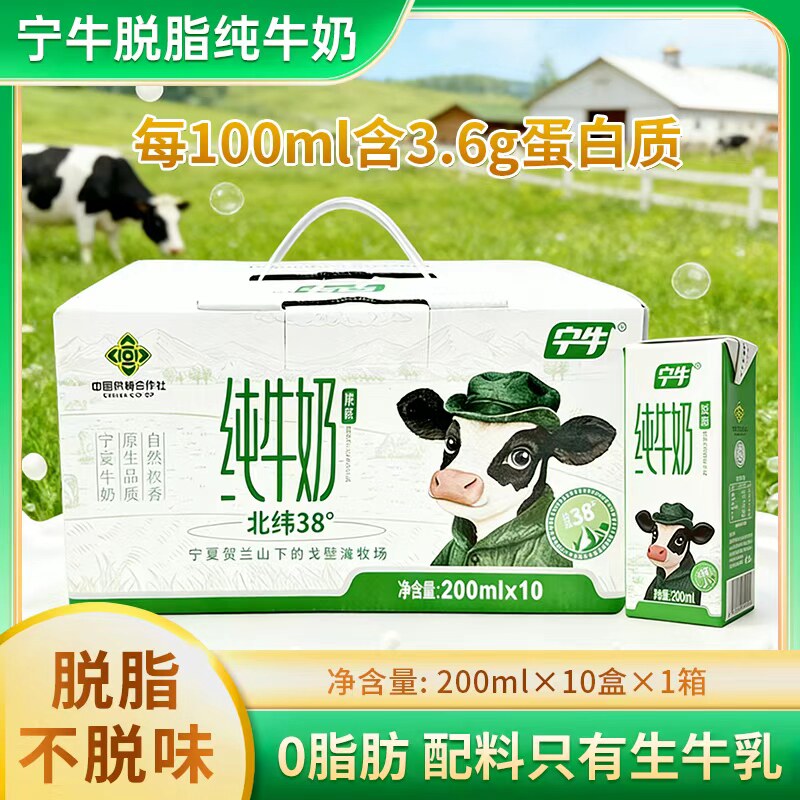 新日期3.6蛋白宁牛脱脂纯牛奶200ml*10盒整箱礼盒学生成人早餐奶