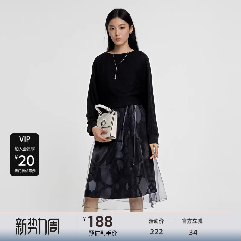 sdeer圣迪奥女装秋圆领收腰晕染网纱连衣裙套装S231Z1402