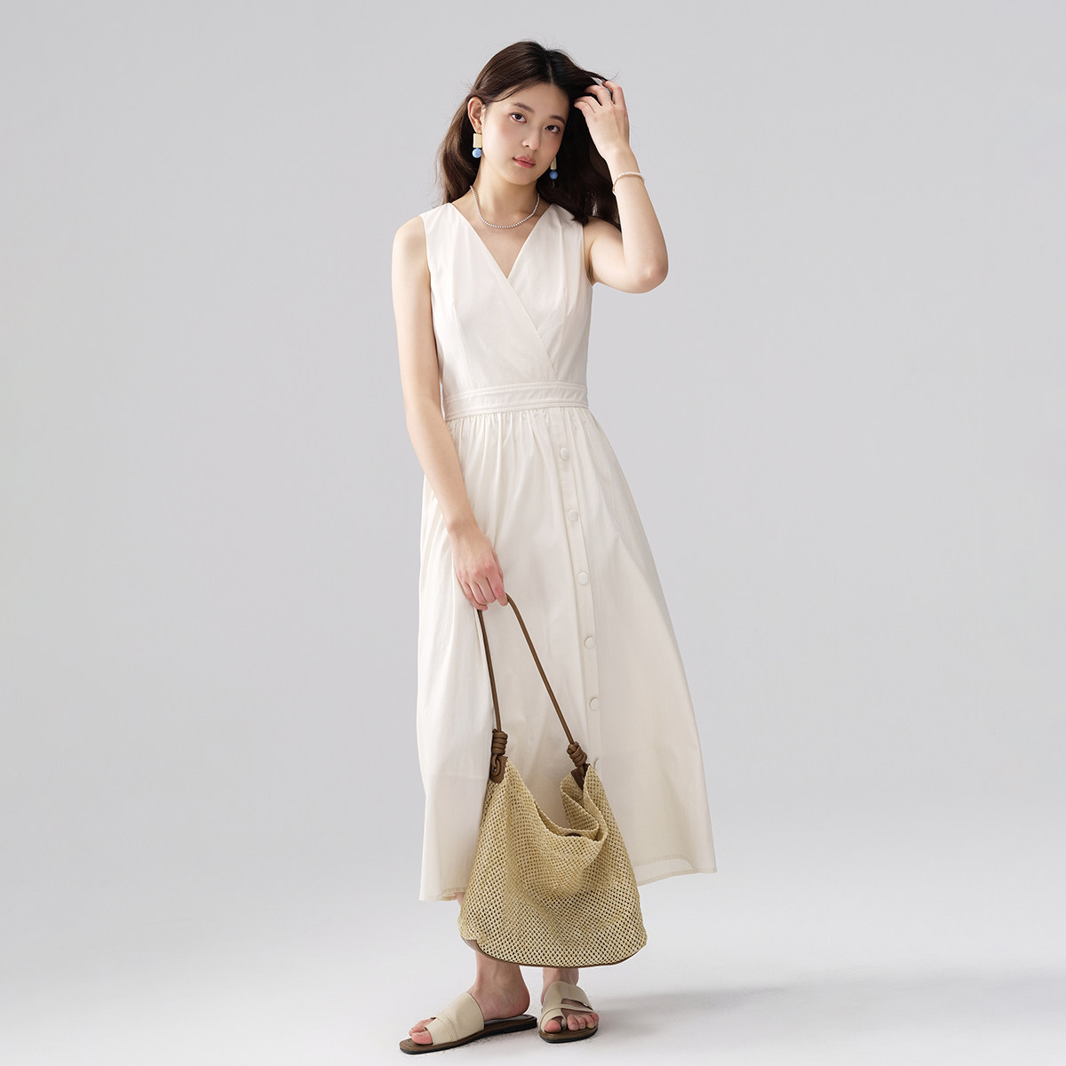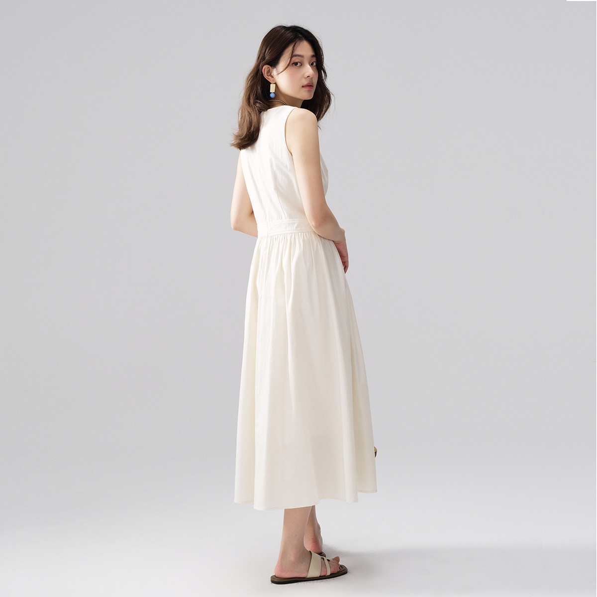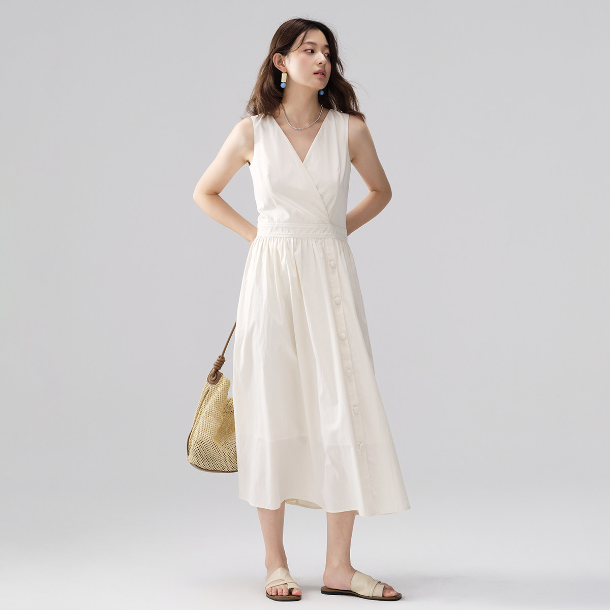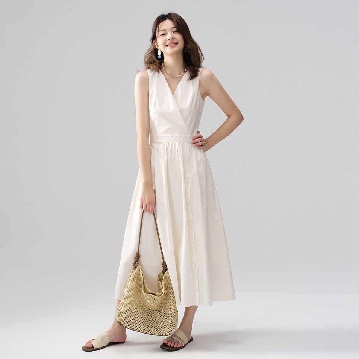 26年夏设计感收腰v领无袖背心裙a字连衣裙女纯棉高级感气质裙子