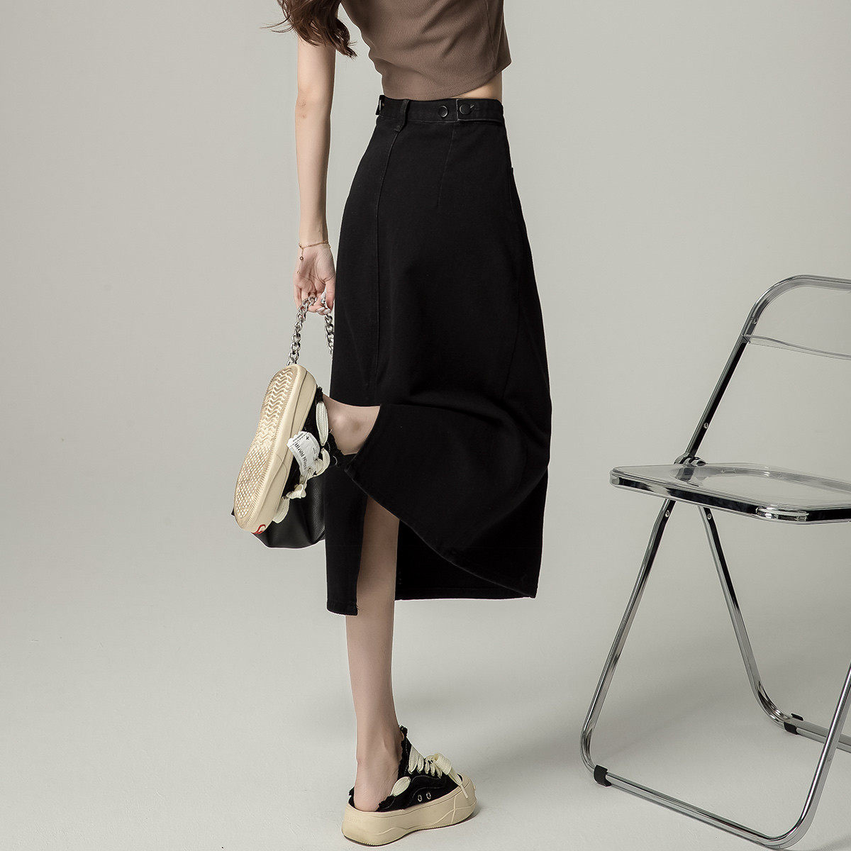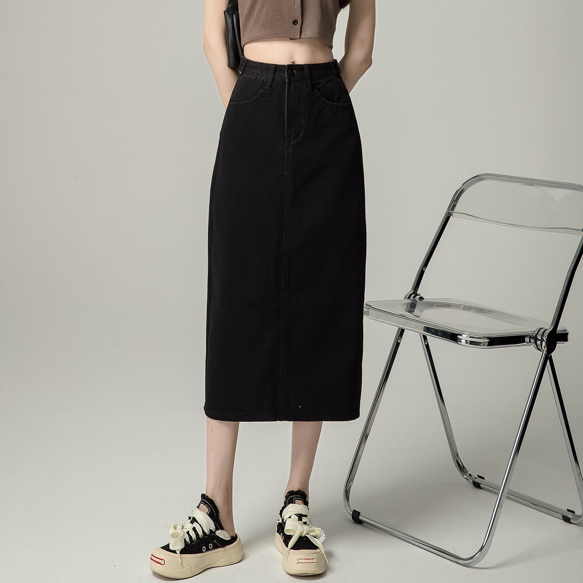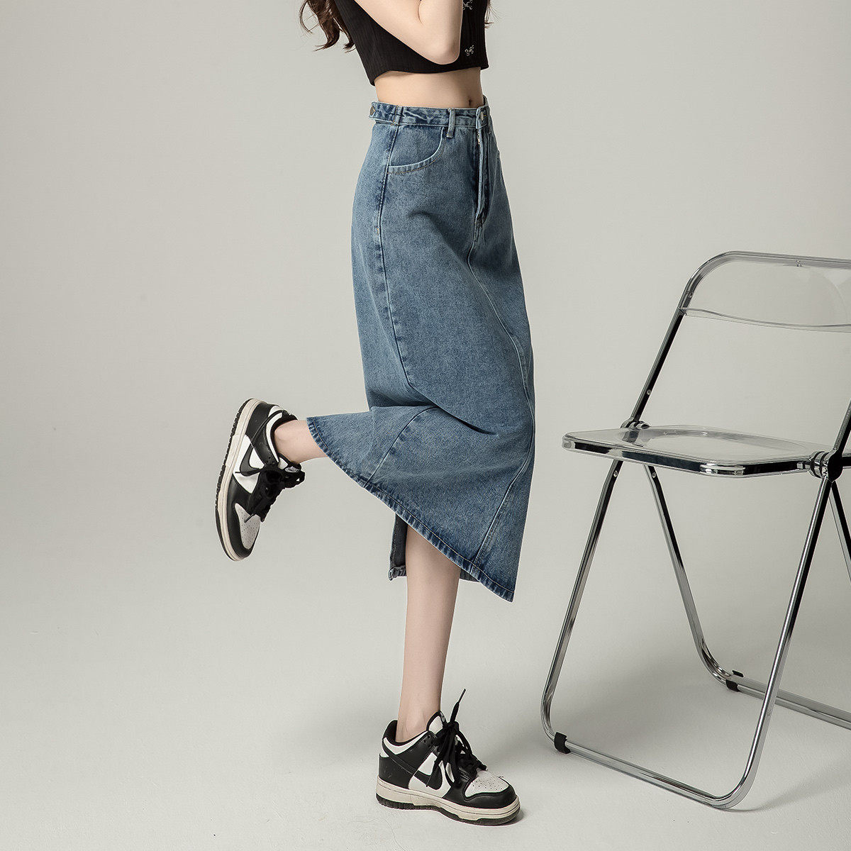 one more高腰牛仔半裙女夏季2025新款A字中长款显瘦包臀开叉裙子