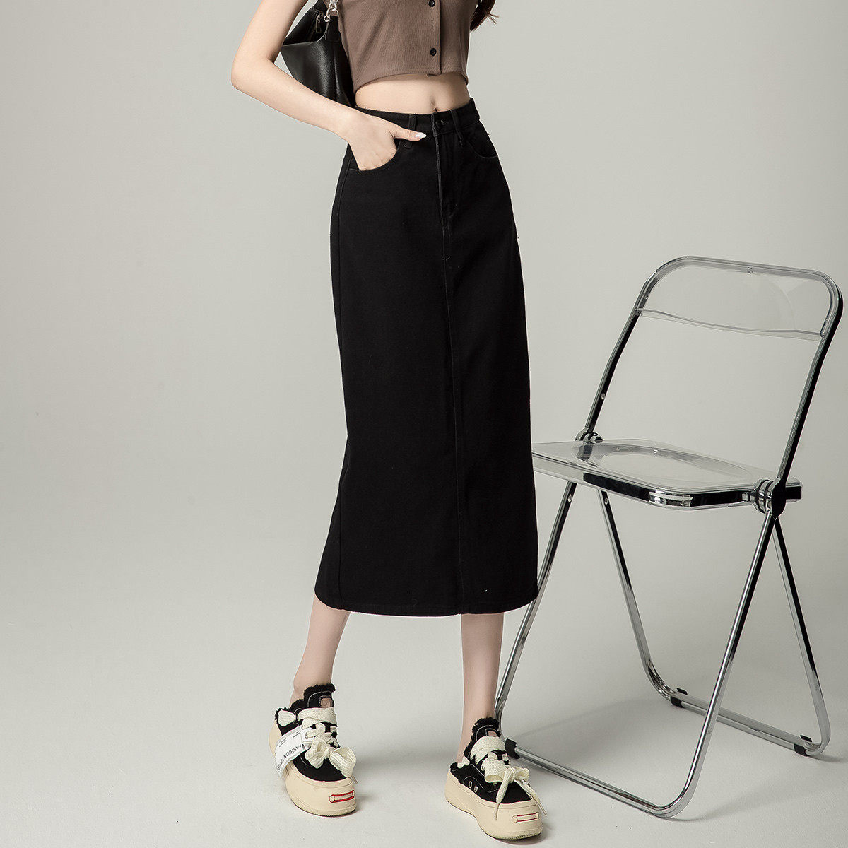 SIINSIIN直筒裙加绒2025年新款高腰收腹半身裙女黑色显瘦A字裙tk