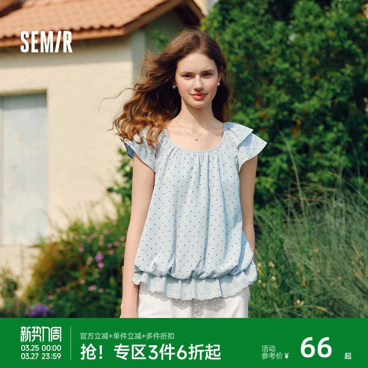森马短袖衬衫女短款U领拼接波点绣花2025夏新款飞袖花苞上衣甜美