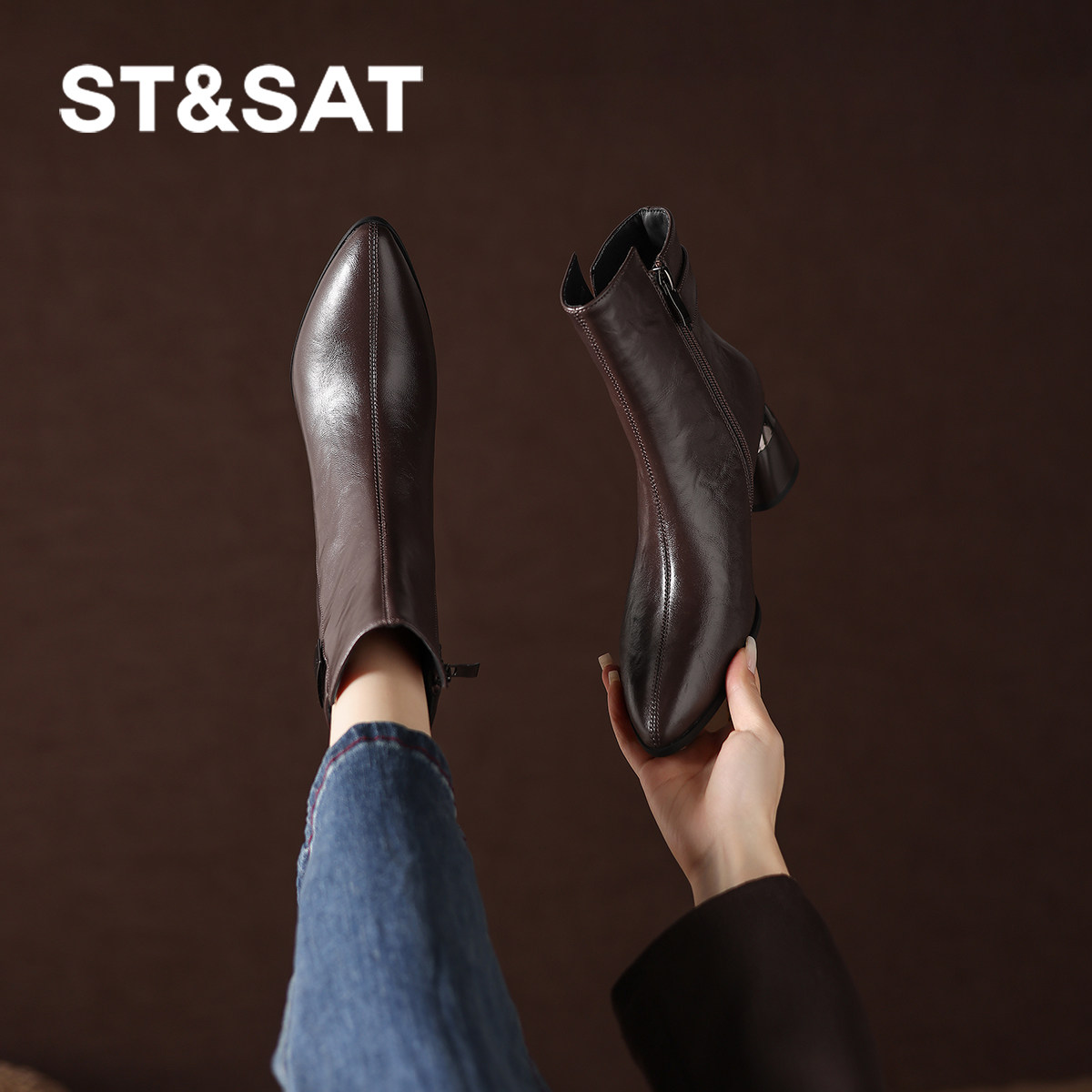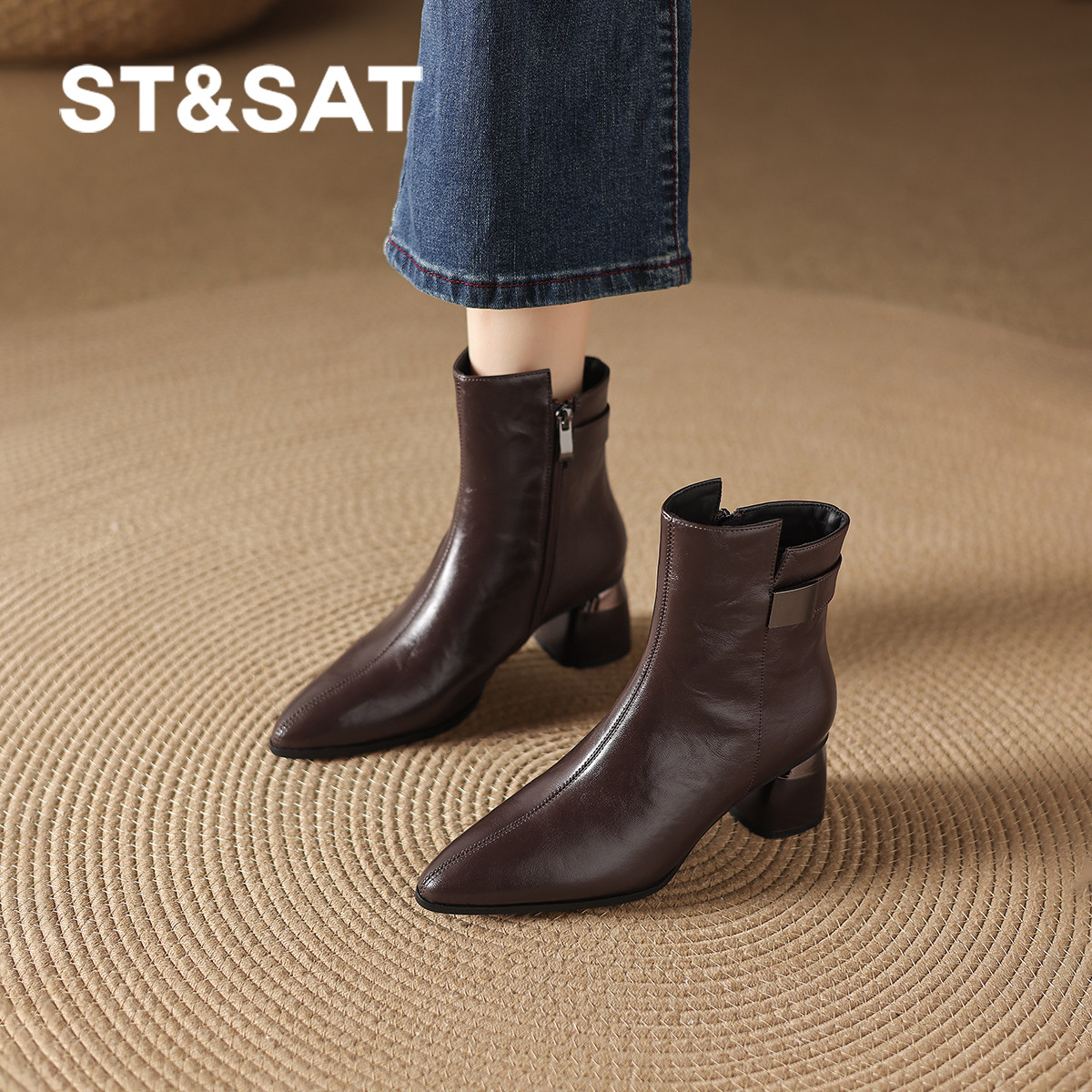 星期六法式尖头短靴女2025新款冬季粗跟气质加绒高跟鞋棕色靴子