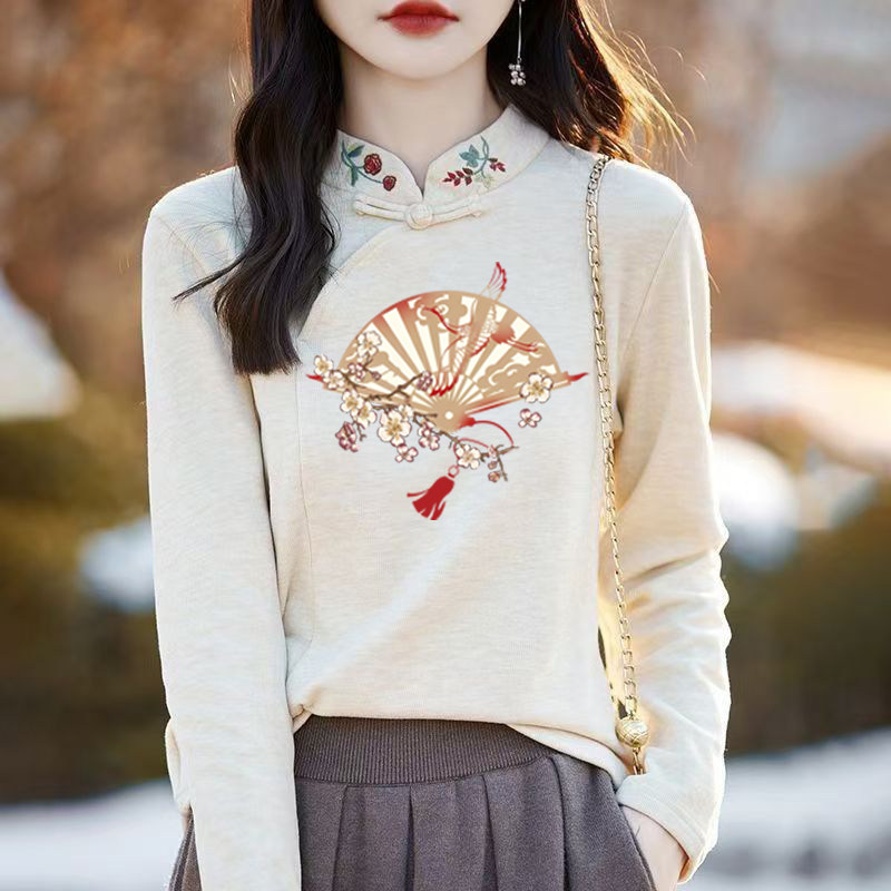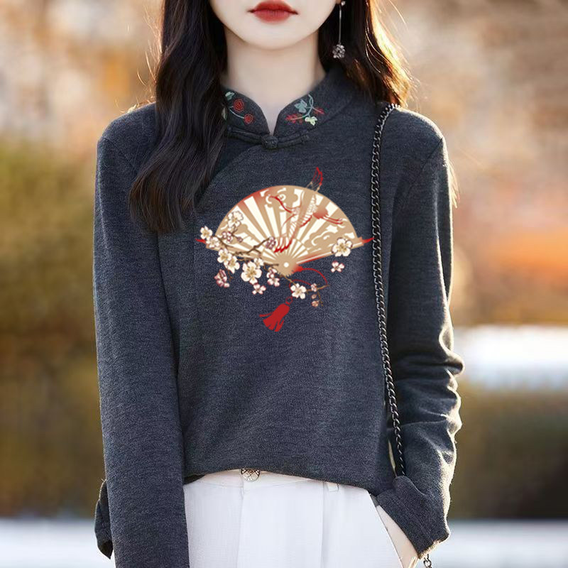 2024秋冬新款双面德绒女士刺绣印花宽松显瘦打底衫国风中式立领