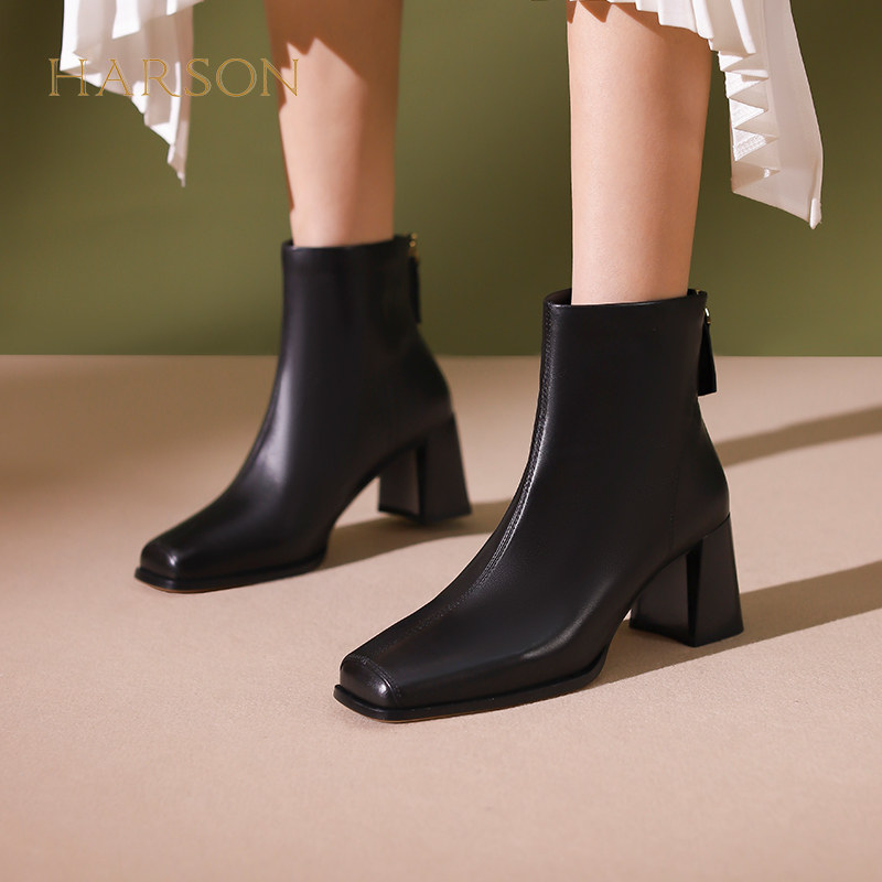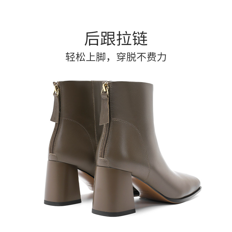 哈森冬季新款方头粗跟后拉链便捷短靴皮面高跟靴子HWA230146