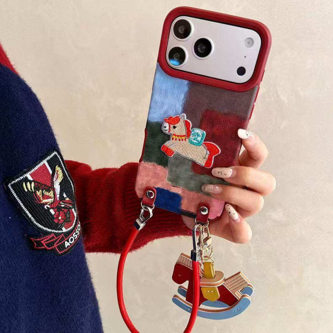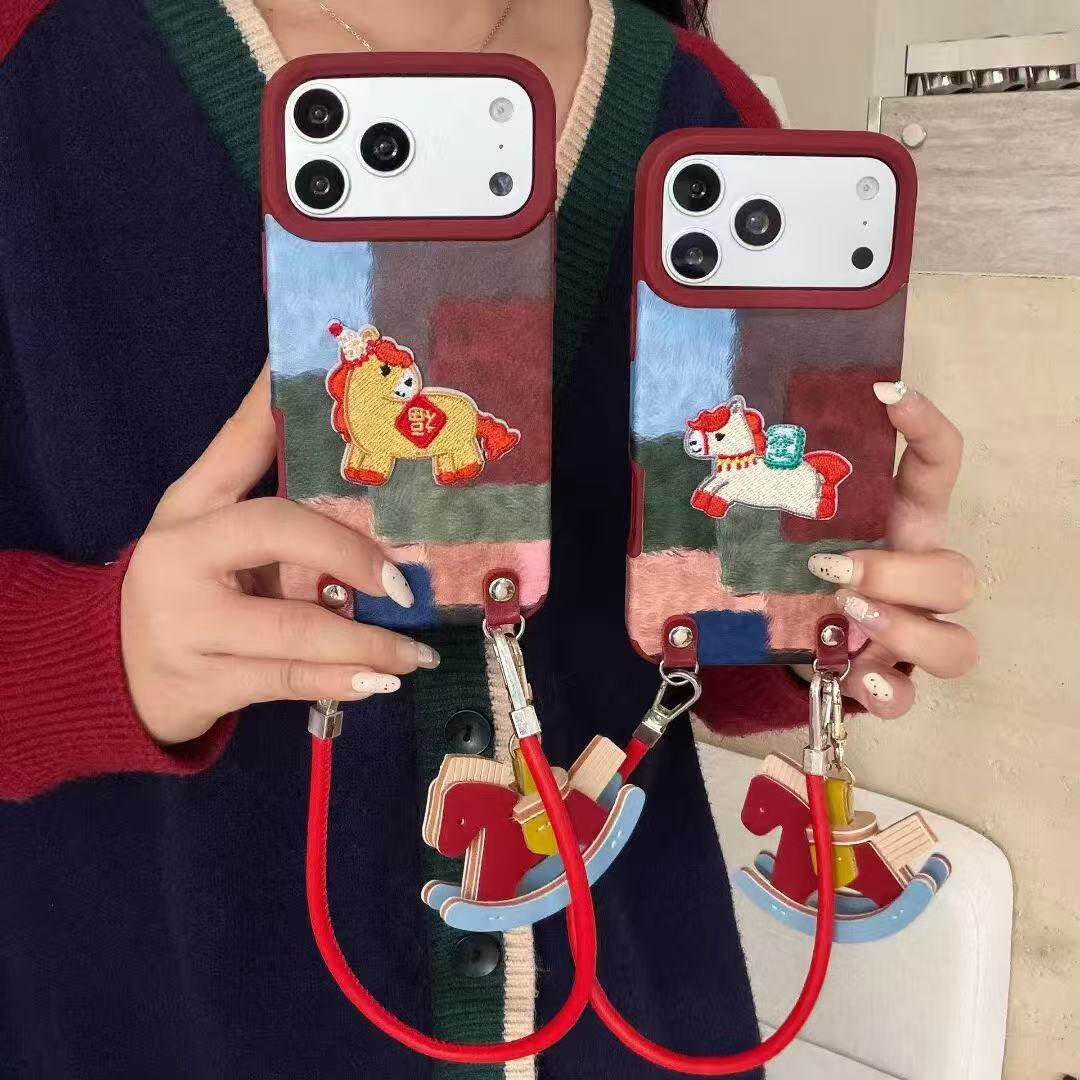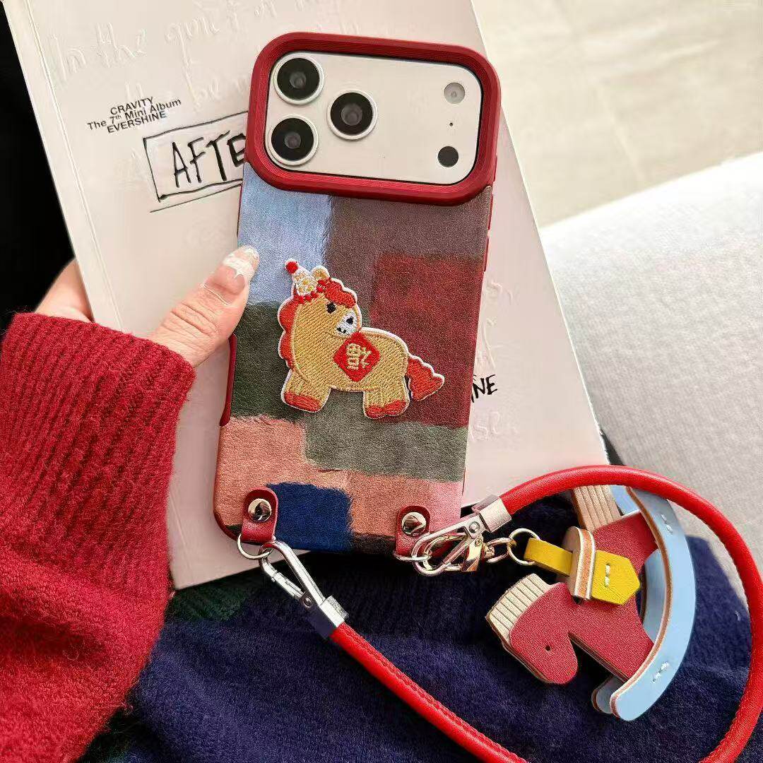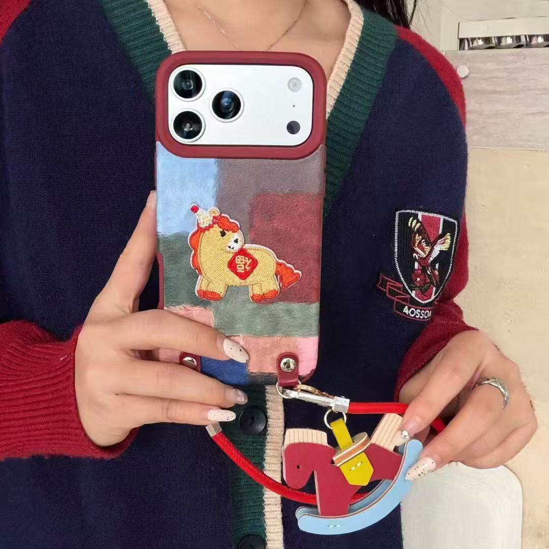 秋冬拼接彩色格纹刺绣小马适用苹果17promax手机壳iphone16pro新年13公仔挂绳14pro皮质15少女11/12防摔软壳