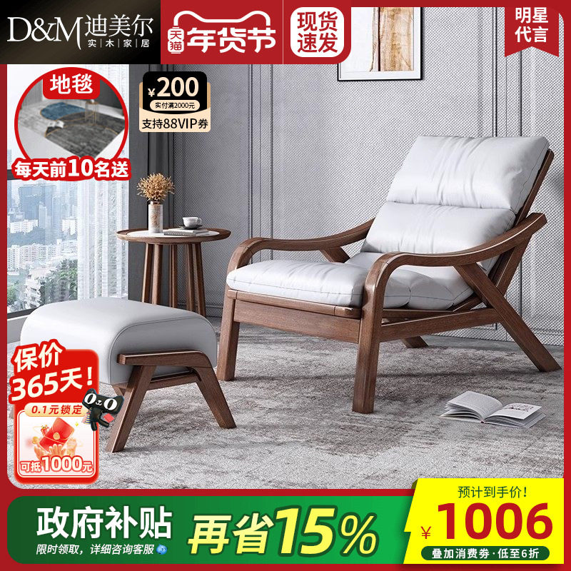 单人位沙发椅子客厅实木阳台休闲椅北欧胡桃木色家用小户型躺椅
