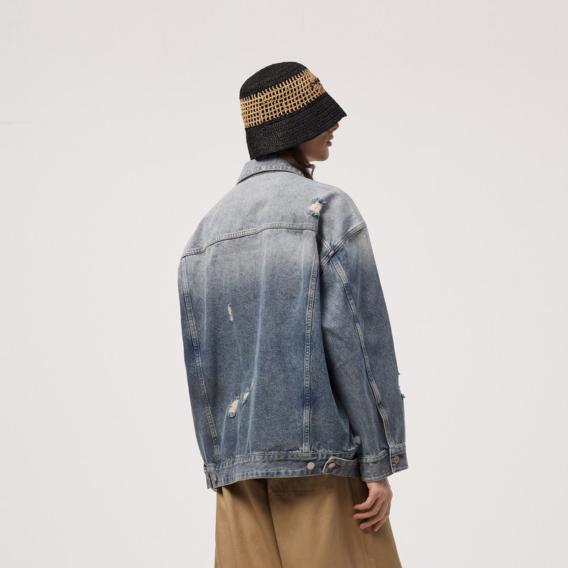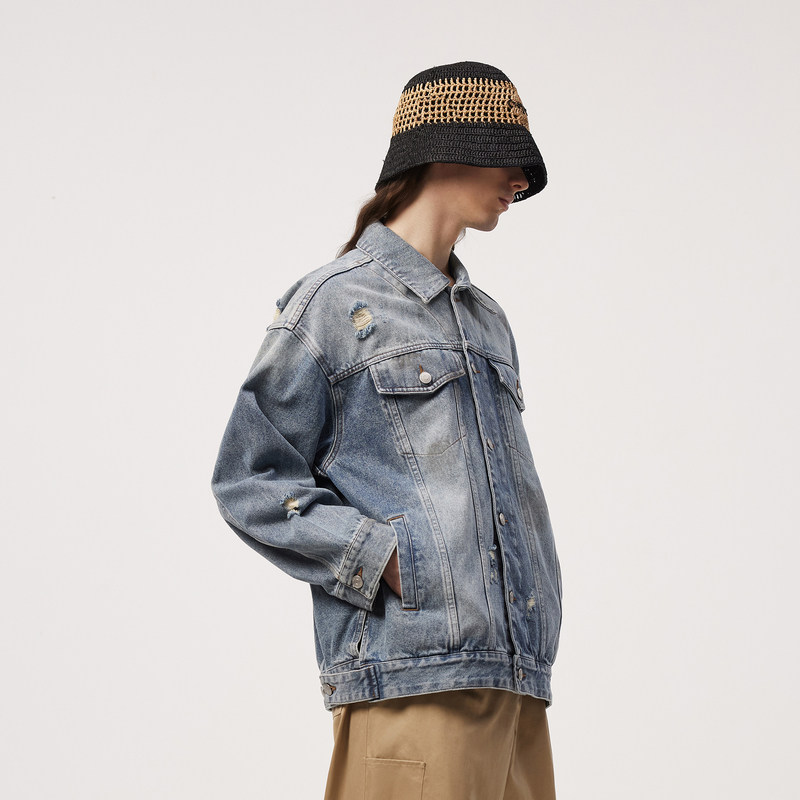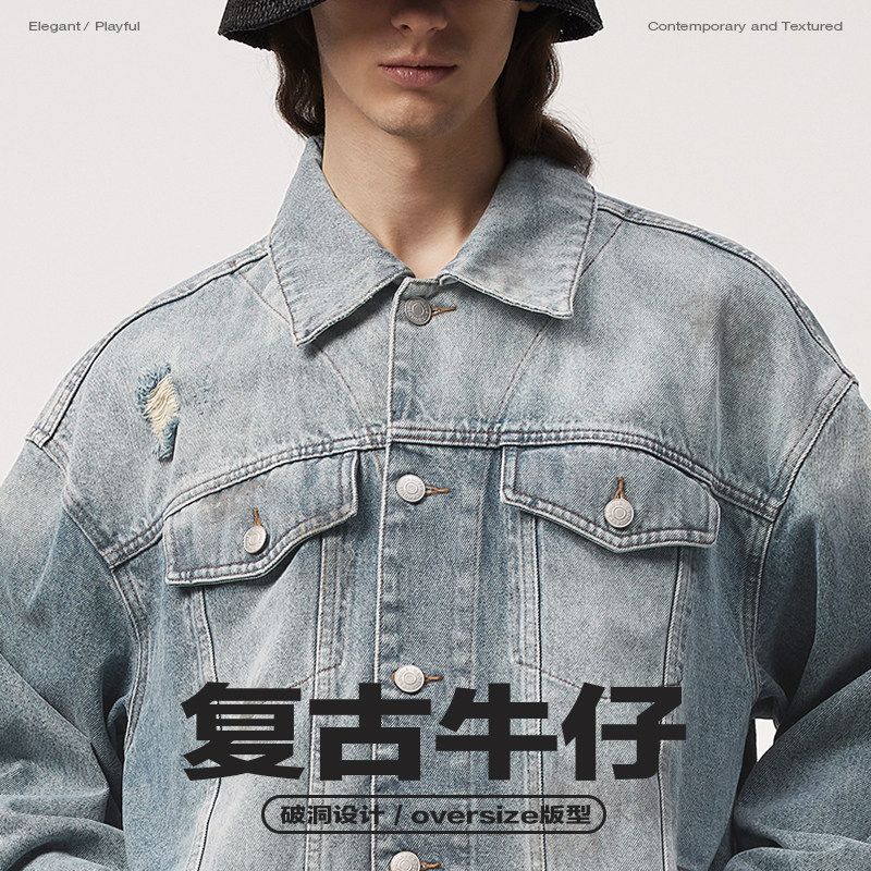 速写男装春秋新款宽松破洞牛仔夹克美式复古潮流设计图案刺绣外套