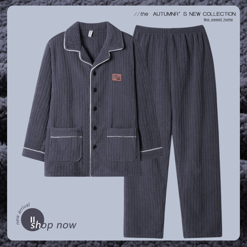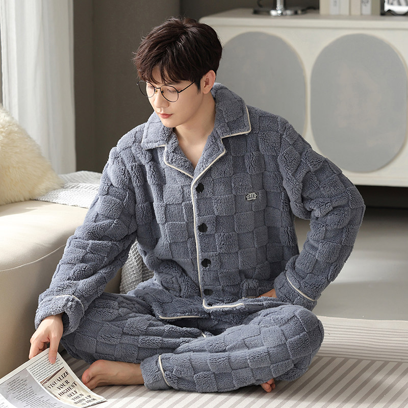 冬季珊瑚绒男士睡衣三层夹棉加厚加绒法兰绒秋冬款家居服保暖套装