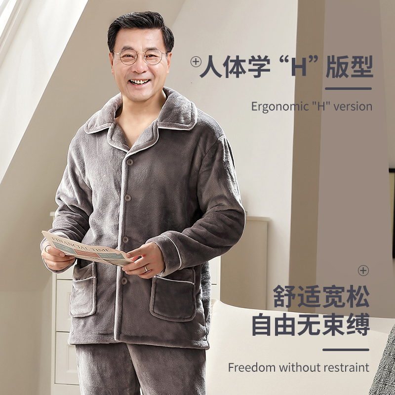 男士睡衣秋冬季三层加厚加绒珊瑚绒夹棉保暖中老年爸爸家居服套装