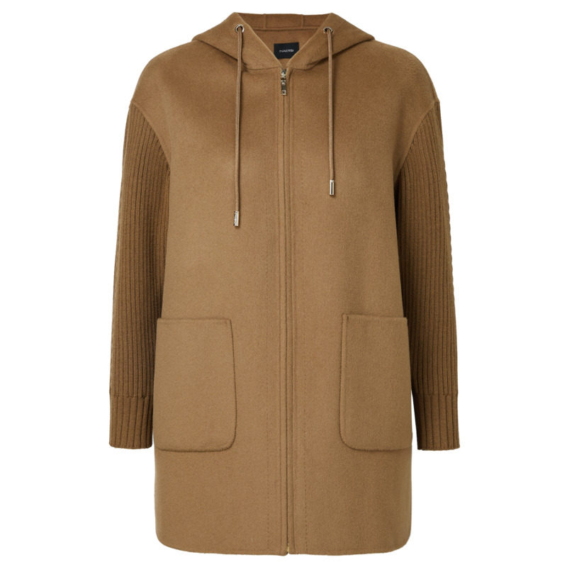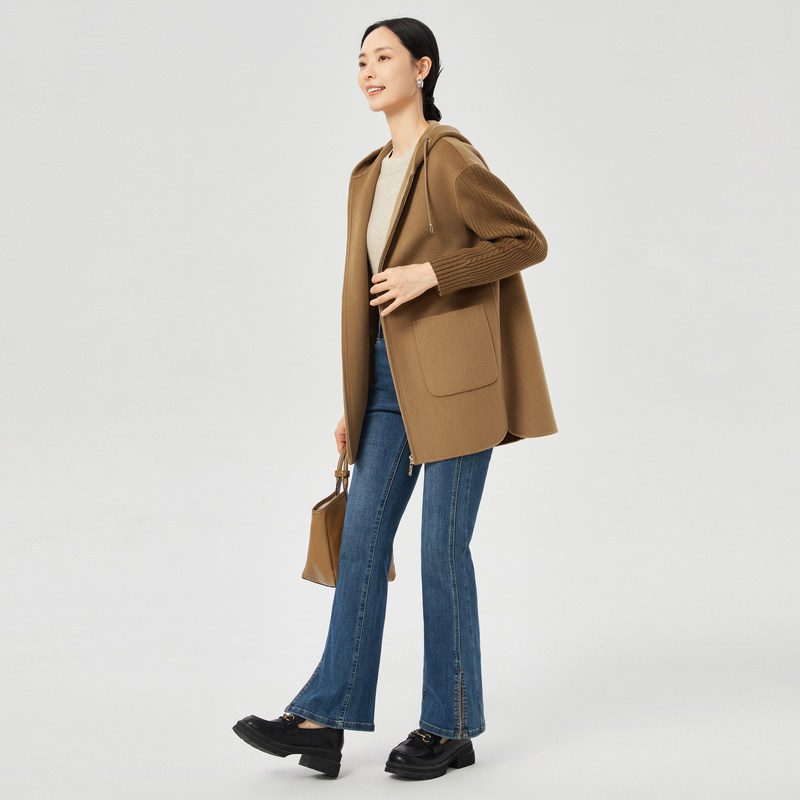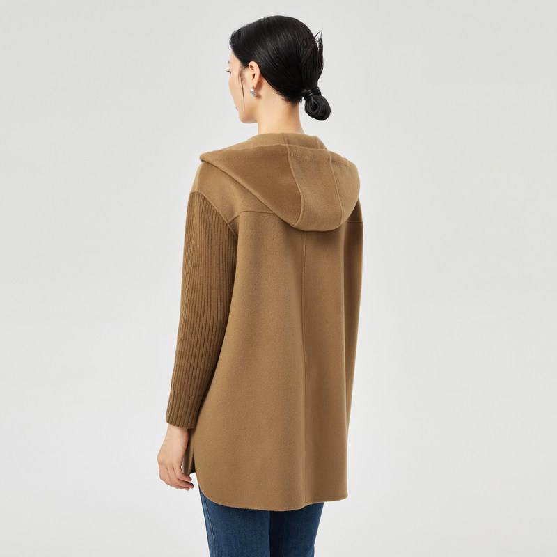 NAERSI娜尔思卡其连帽卡其双面呢大衣2025年冬季通勤中长毛呢外套