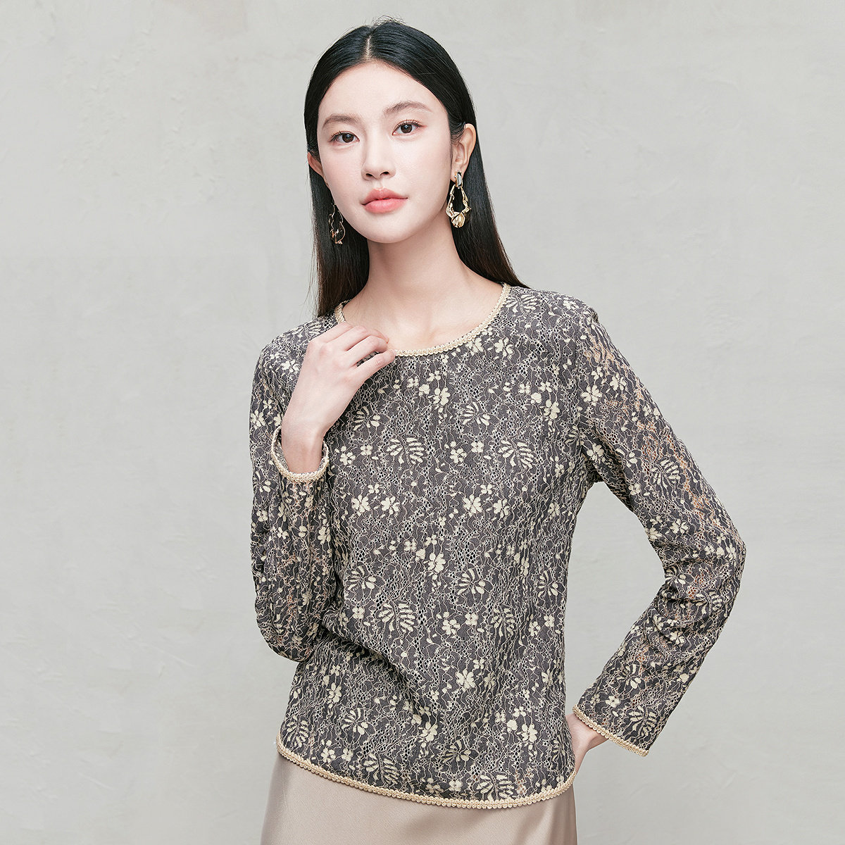 卡卡正品官方旗舰店蕾丝拼接镂空打底衫女秋冬加绒内搭长袖T上衣
