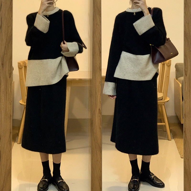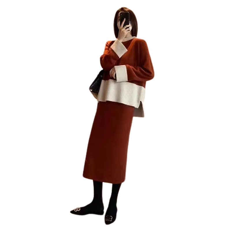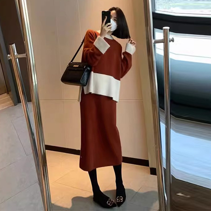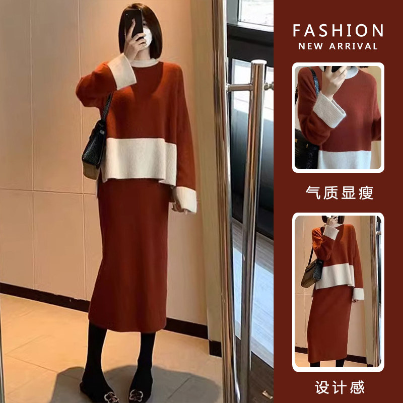 婧麒孕妇套装春秋款2025新款时尚针织连衣裙长袖撞色宽松毛衣外套