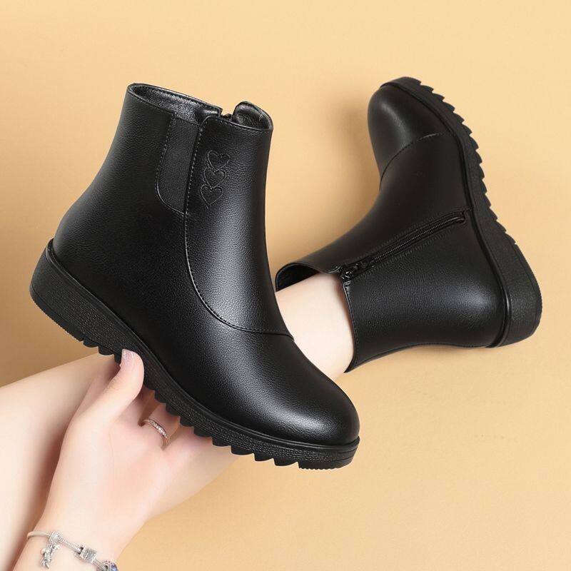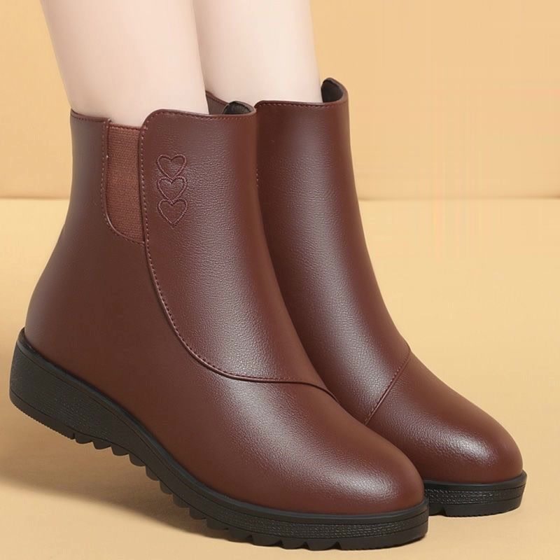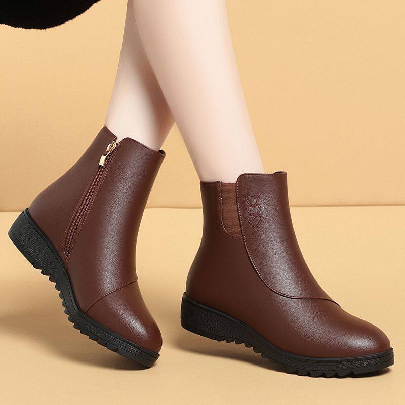 品牌鞋妈妈鞋短靴软皮冬季棉鞋女软底加绒皮鞋中老年防滑平底女靴
