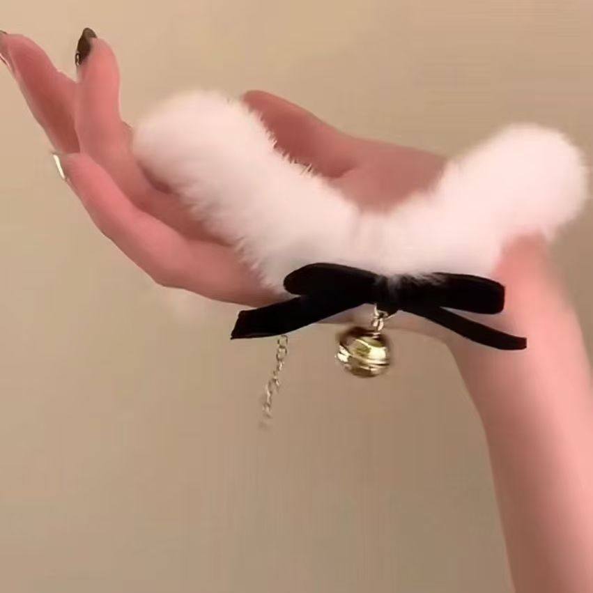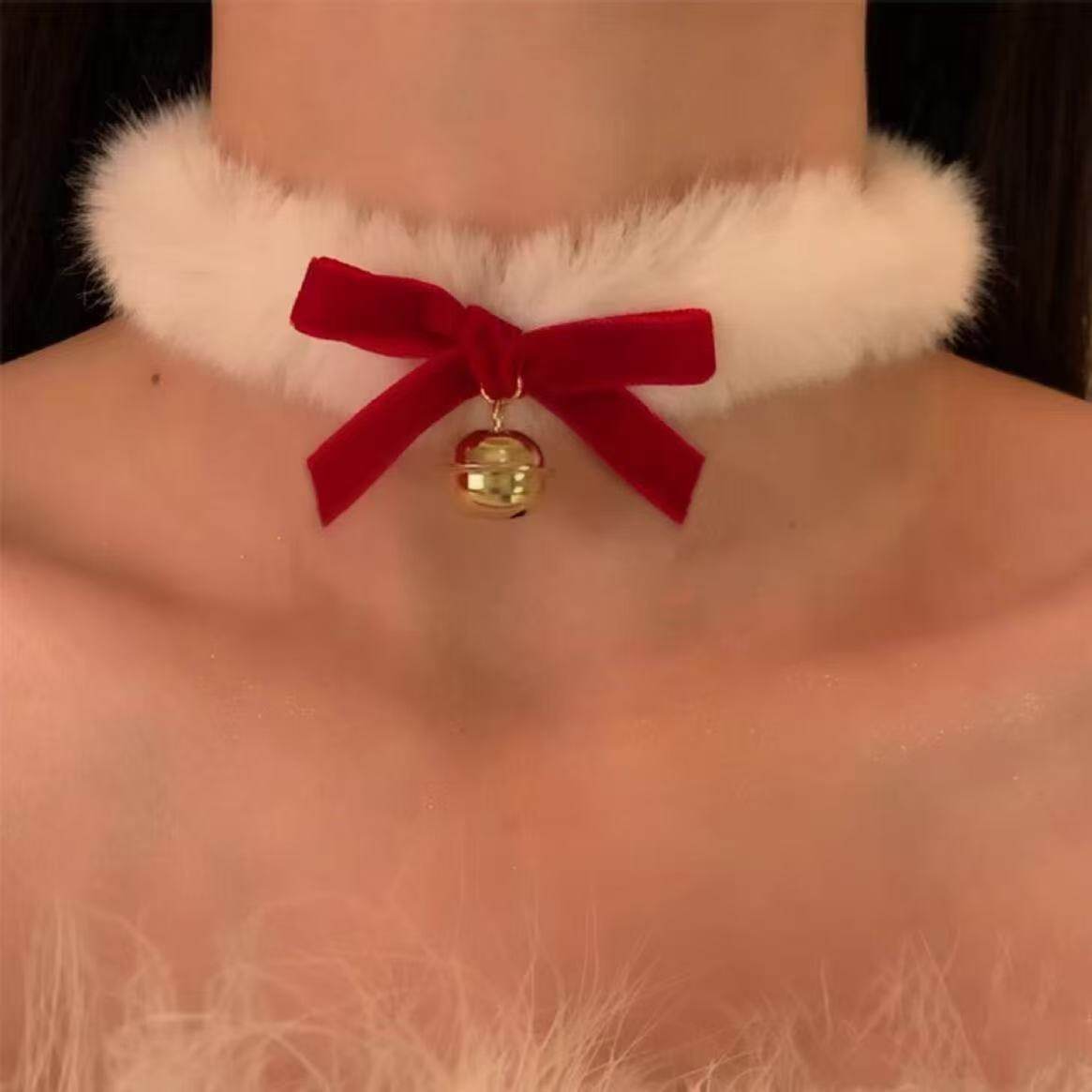 新款圣诞节白色毛绒choker蝴蝶结铃铛项圈项链女秋冬高级感锁骨链