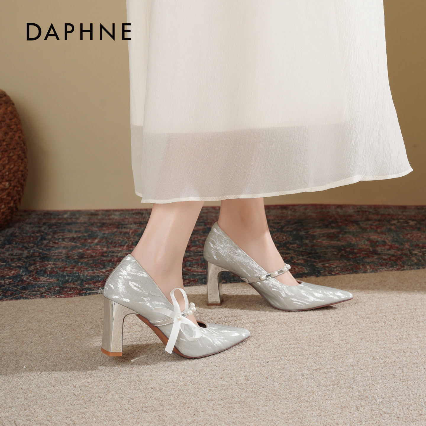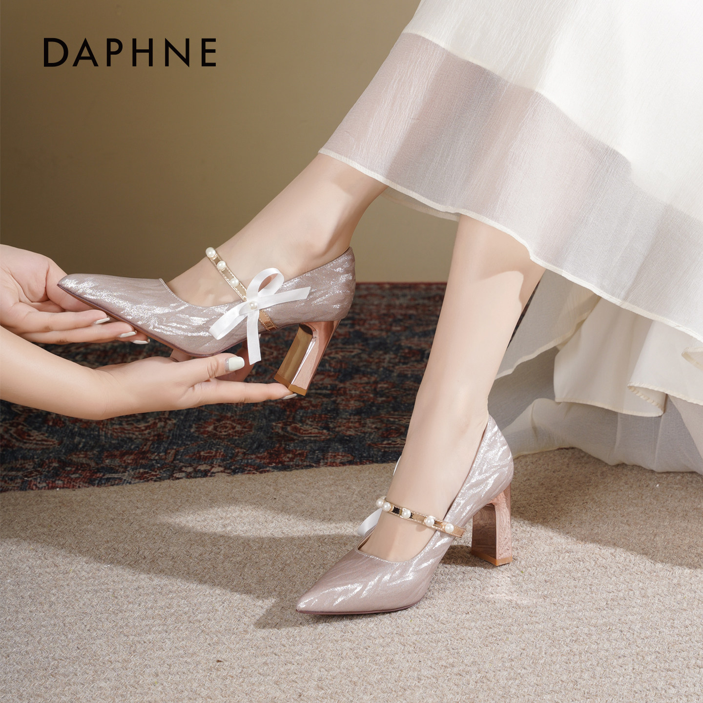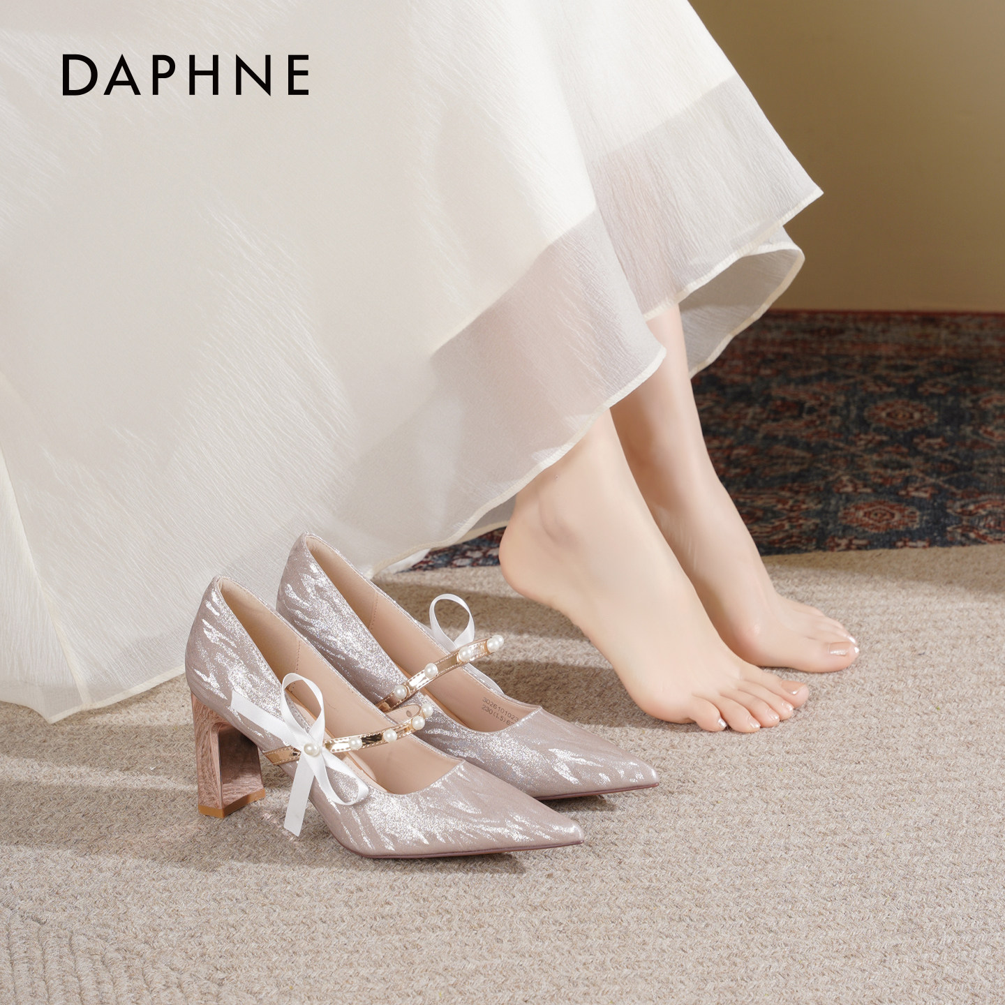达芙妮高跟鞋女2026新款春季法式蝴蝶结婚纱婚鞋粗跟不累脚单鞋女