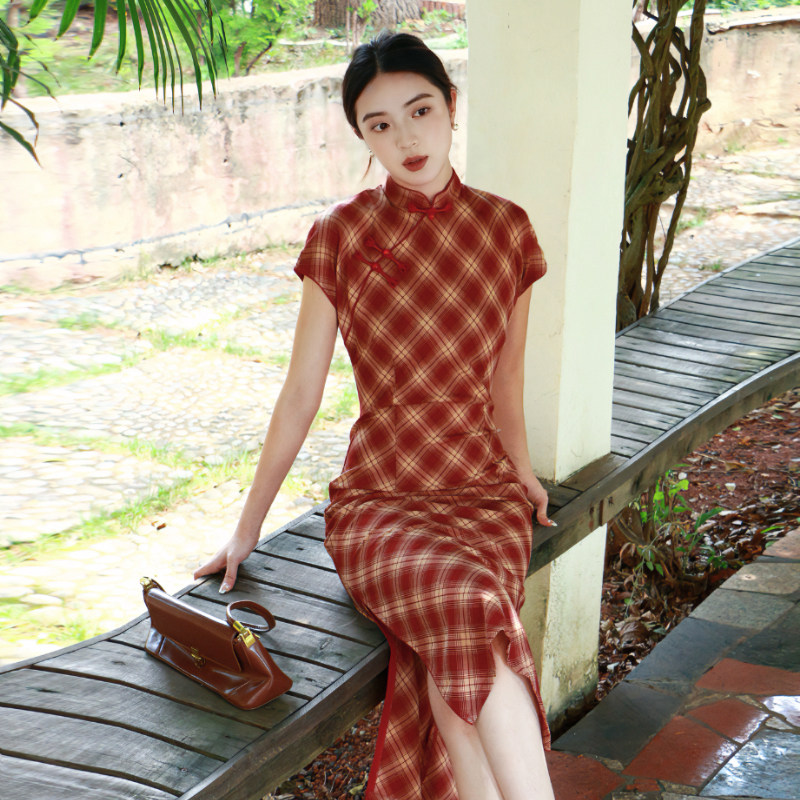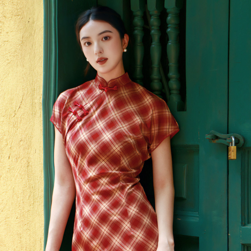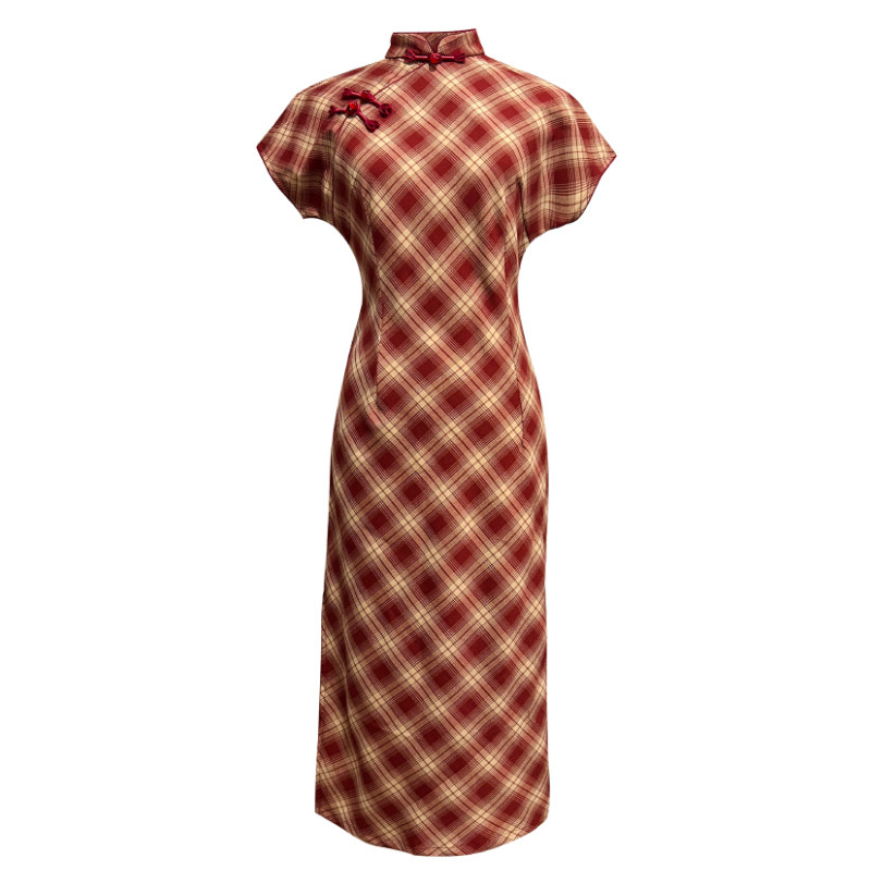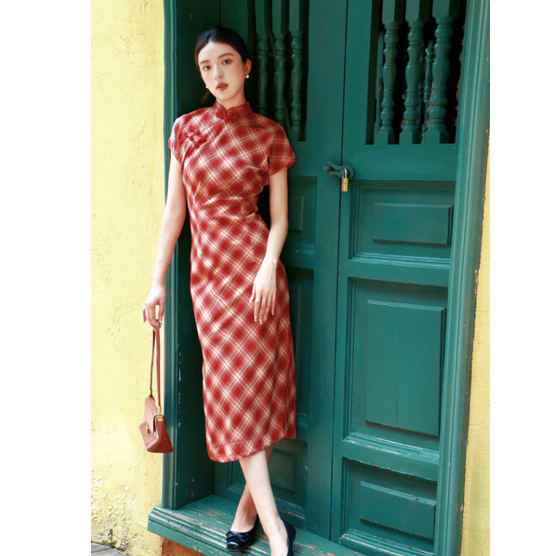 JUJU定制新中式国风复古改良旗袍格纹短袖连衣裙淑女文艺旗袍女夏